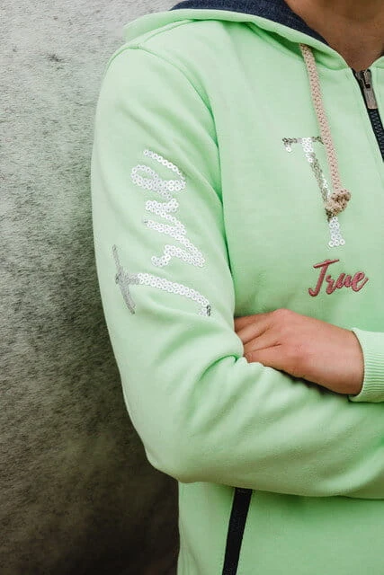 - Przód oraz oba ramiona ozdobione błyszczącymi cekinami – trwałość cekinów sprawdzaliśmy przez równy rok, nosiliśmy je pod kurtkami, kamizelkami, w różnych warunkach pogodowych, wielokrotnie praliśmy – do dziś nie odpadł ani jeden cekin!