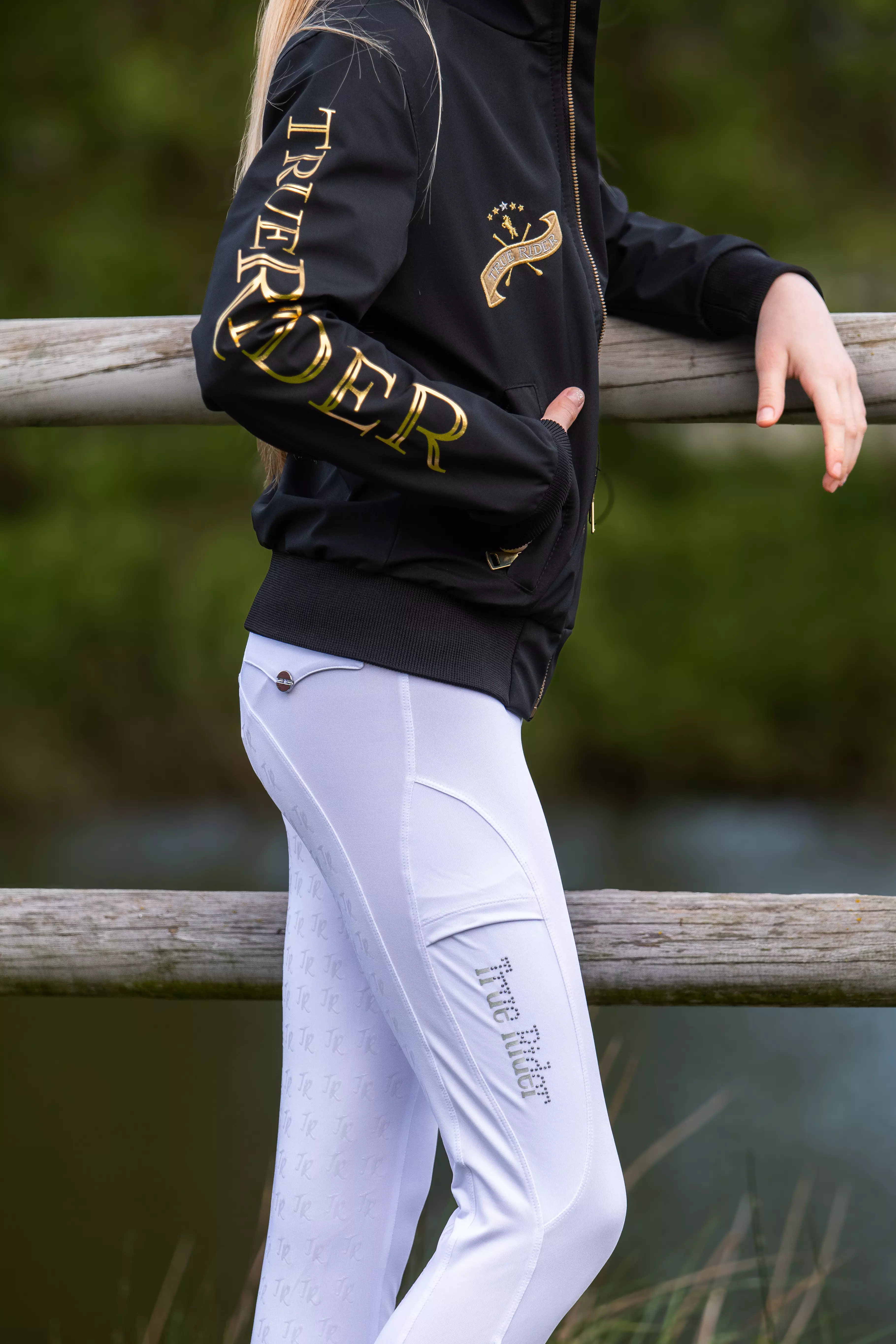- Elastyczny ściągacz na dole, uniemożliwiający podwijanie się materiału w trakcie poruszania się na koniu.