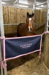 Praktyczna bramka stanowiąca zamknięcie boksu i umożliwiająca koniowi wyglądanie na zewnątrz. Bramka na boks doskonale sprawdzi się na co dzień w stajni oraz podczas zawodów. Wykonana jest z mocnej i wodoodpornej tkaniny poliestrowej, którą łatwo utrzymać w czystości. Cena zawiera personalizowane hafty, dowolny kolor oraz obszycie.