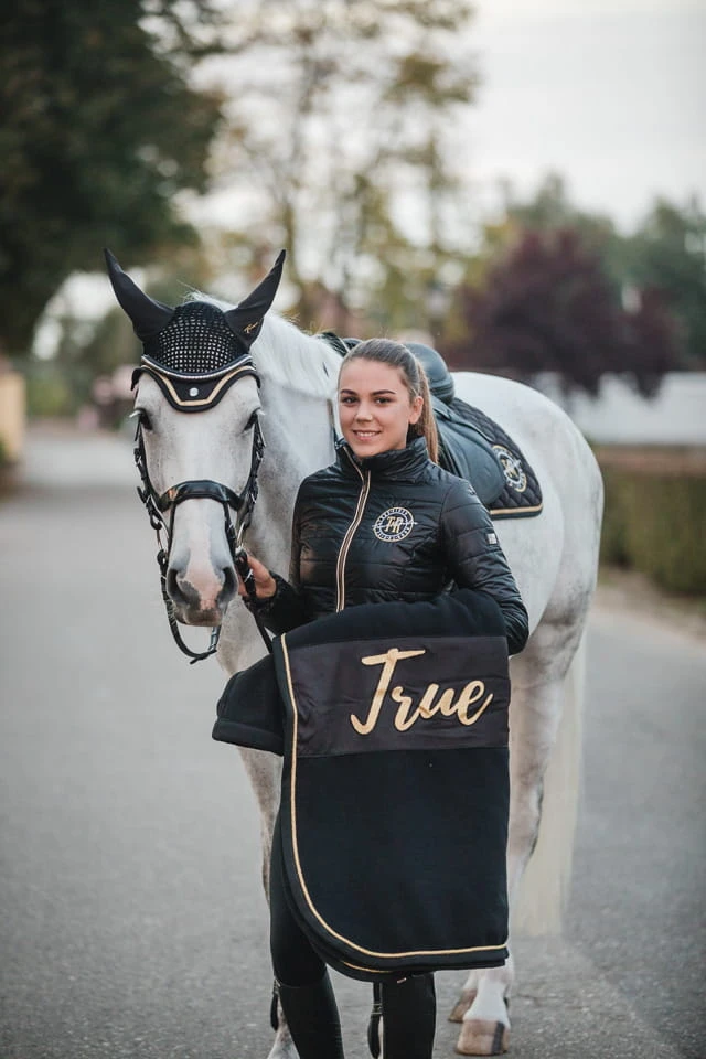 - Z lewej strony haft Born to Ride utrzymany jest w kolorach złota i nawiązuje do kolekcji Black & Gold, w której znajdziesz kamizelkę, Thermo Golf, zimowe legginsy, Softshell, kurtkę, nauszniki oraz derkę. Dzięki temu stworzysz elegancki komplet zarówno dla siebie jak i dla konia.