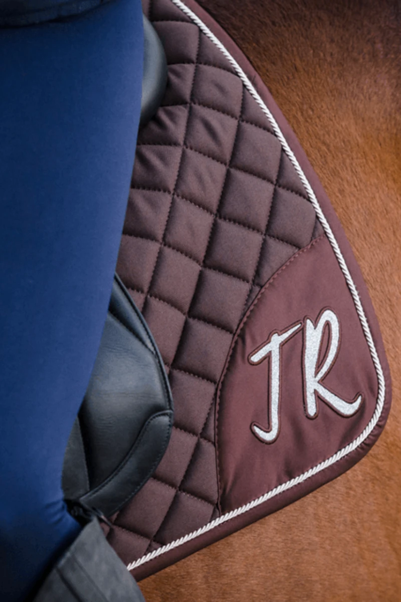 - Prawa strona czapraka Sparkle ozodbiona blaszką z grawerowanym logo, które dodaje eleganckiego wyglądu czaprakowi i w ten sposób nawiązuje też do kolekcji Sparkle nauszników tworząc idealny komplet