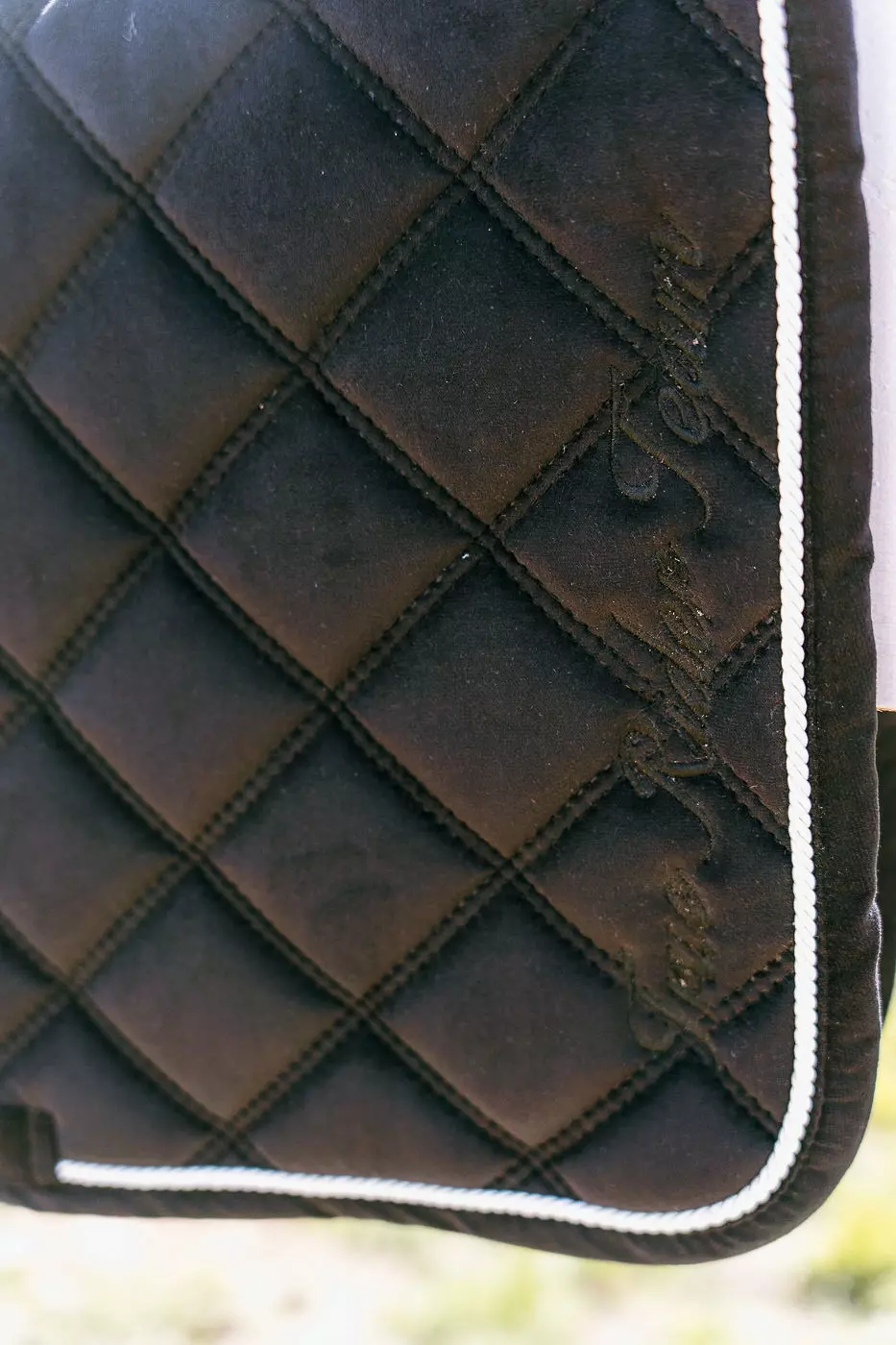 - Lewa strona czapraka Velvet ozdobiona jest haftem True Rider w kolorze idealnie dopasowanym do czapraka.