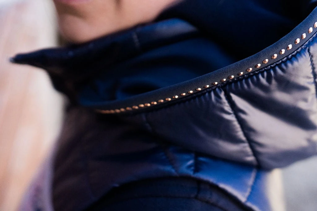 - Rose gold'owo granatowe logo naszej marki na przodzie kamizelki uzupełnione o dwa kryształki dodaje jej uroku.