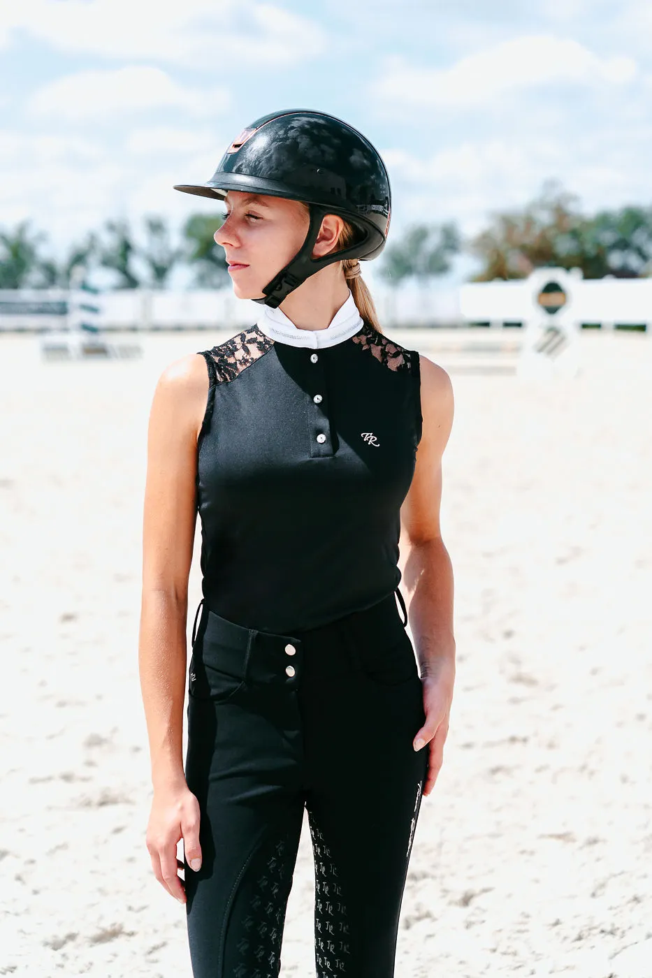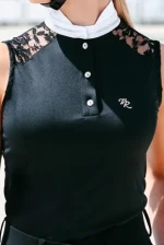 Opcja bez rękawów była moim faworytem :) wiem, że nie każdy uważa koszulę konkursową bez ramion za elegancką, ale pod frakiem i tak nie widać, że nie ma rękawów a np. dla nas ujeżdżeniowców jest zbawieniem podczas upalnych startów :P Uwielbiam też w niej jeździć na codziennych treningach (w wersji z ciemnym kołnierzem) - jest mi znacznie chłodniej, a dzięki niezwykłej koronce i detalom czuję się w niej ultra elegancko.