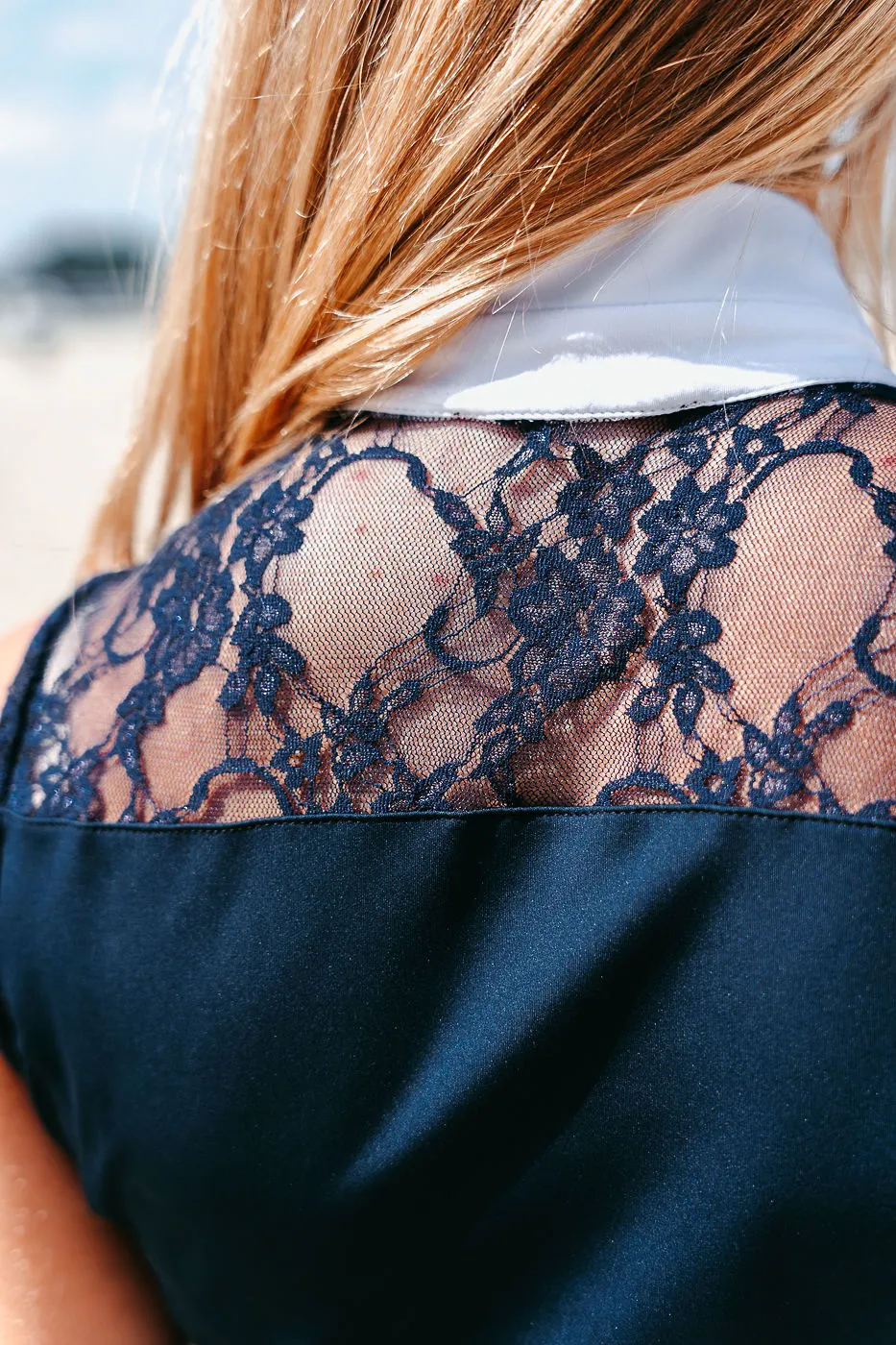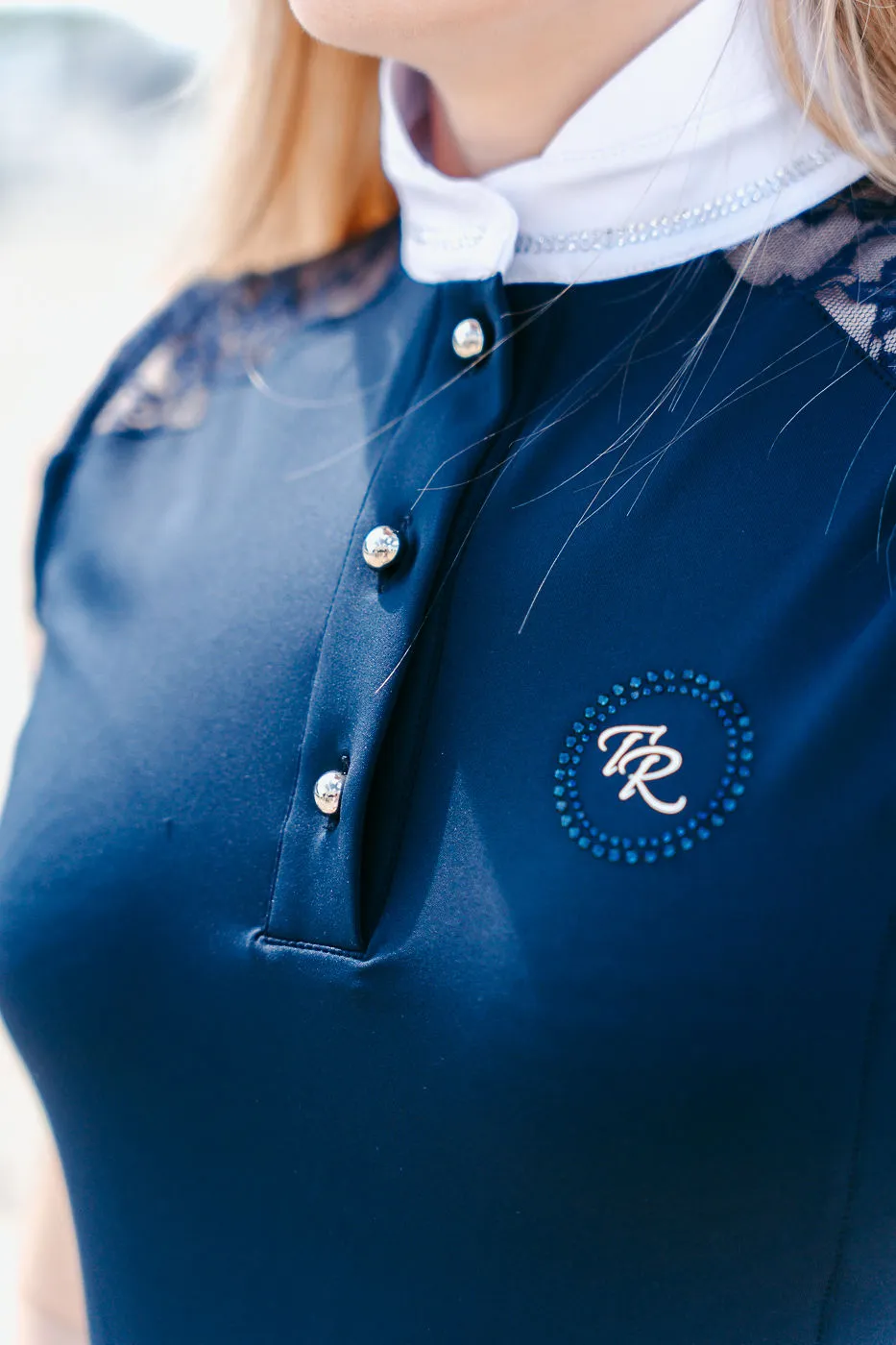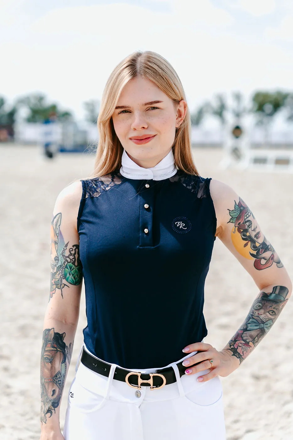 Opcja bez rękawów była moim faworytem :) wiem, że nie każdy uważa koszulę konkursową bez ramion za elegancką, ale pod frakiem i tak nie widać, że nie ma rękawów a np. dla nas ujeżdżeniowców jest zbawieniem podczas upalnych startów :P Uwielbiam też w niej jeździć na codziennych treningach (w wersji z ciemnym kołnierzem) - jest mi znacznie chłodniej, a dzięki niezwykłej koronce i detalom czuję się w niej ultra elegancko.