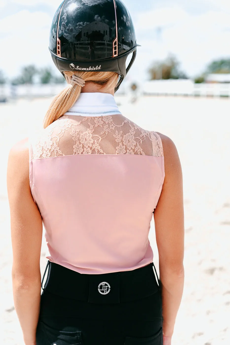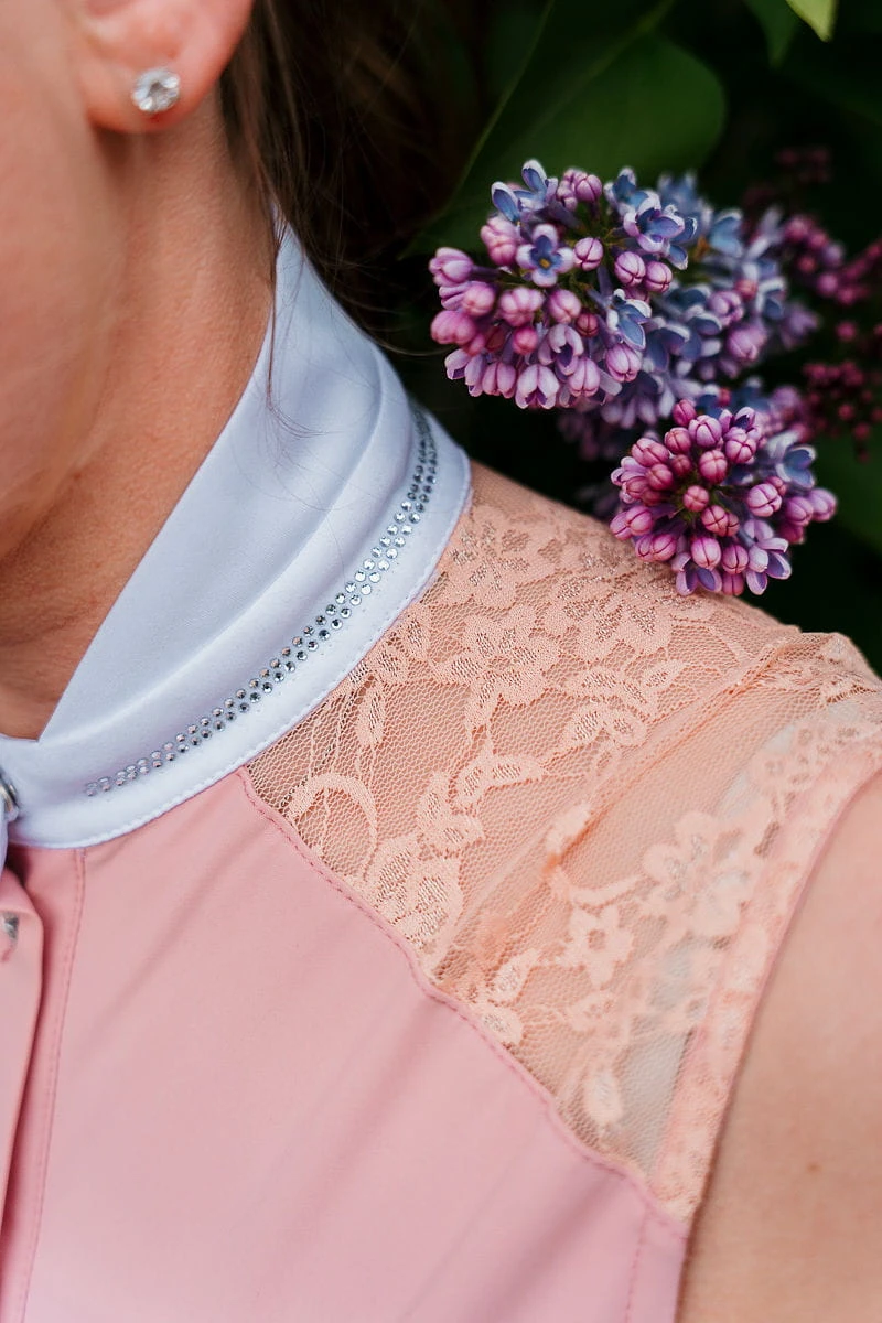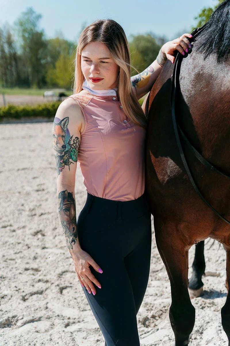Opcja bez rękawów była moim faworytem :) wiem, że nie każdy uważa koszulę konkursową bez ramion za elegancką, ale pod frakiem i tak nie widać, że nie ma rękawów a np. dla nas ujeżdżeniowców jest zbawieniem podczas upalnych startów :P Uwielbiam też w niej jeździć na codziennych treningach (w wersji z ciemnym kołnierzem) - jest mi znacznie chłodniej, a dzięki niezwykłej koronce i detalom czuję się w niej ultra elegancko.