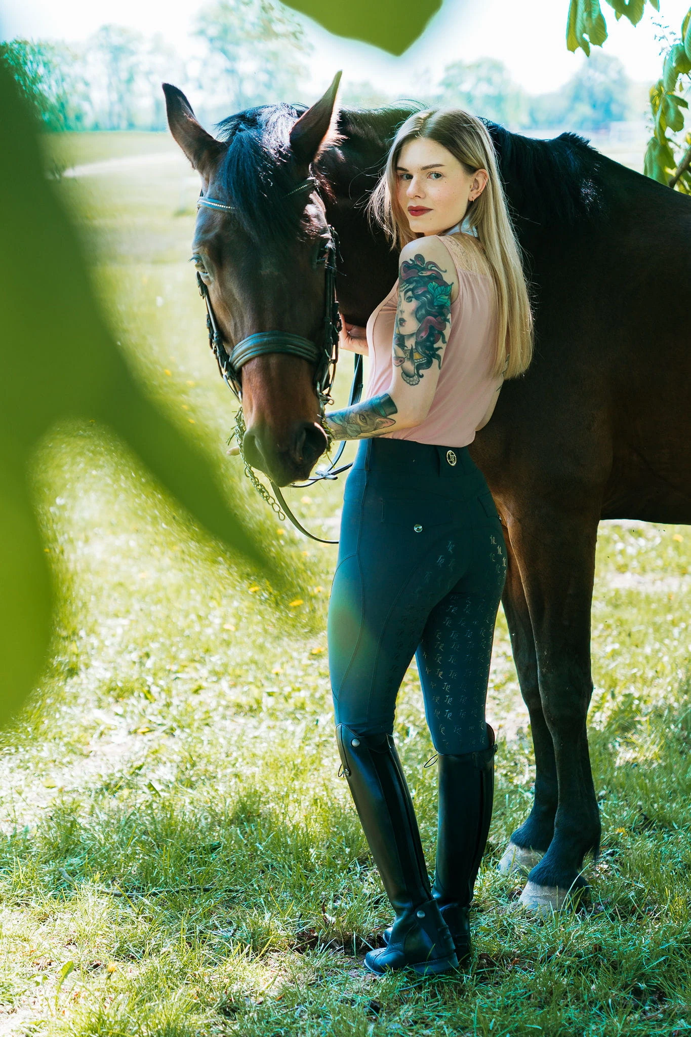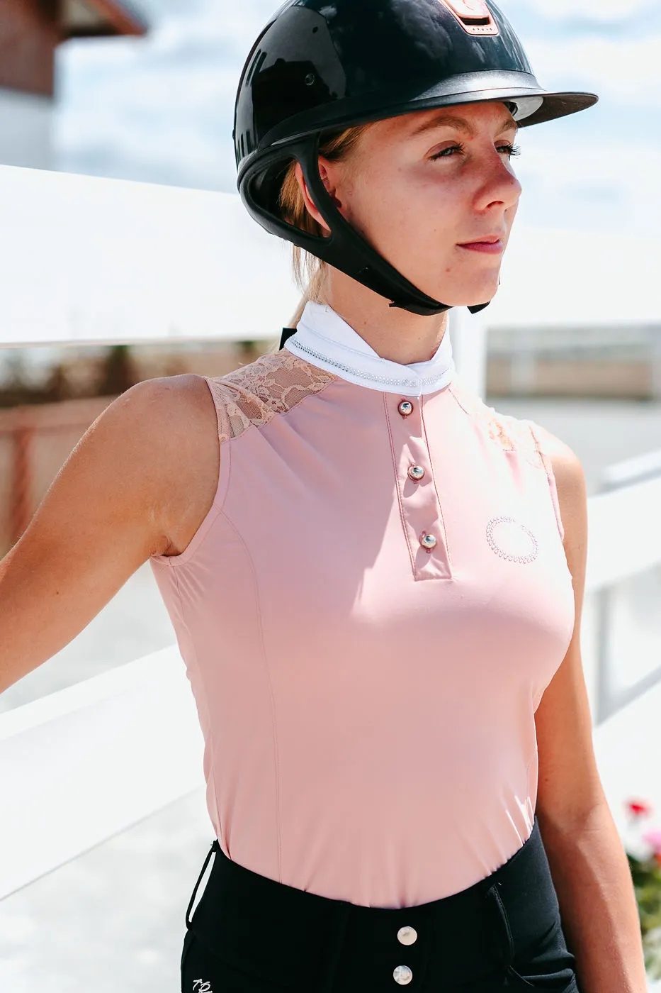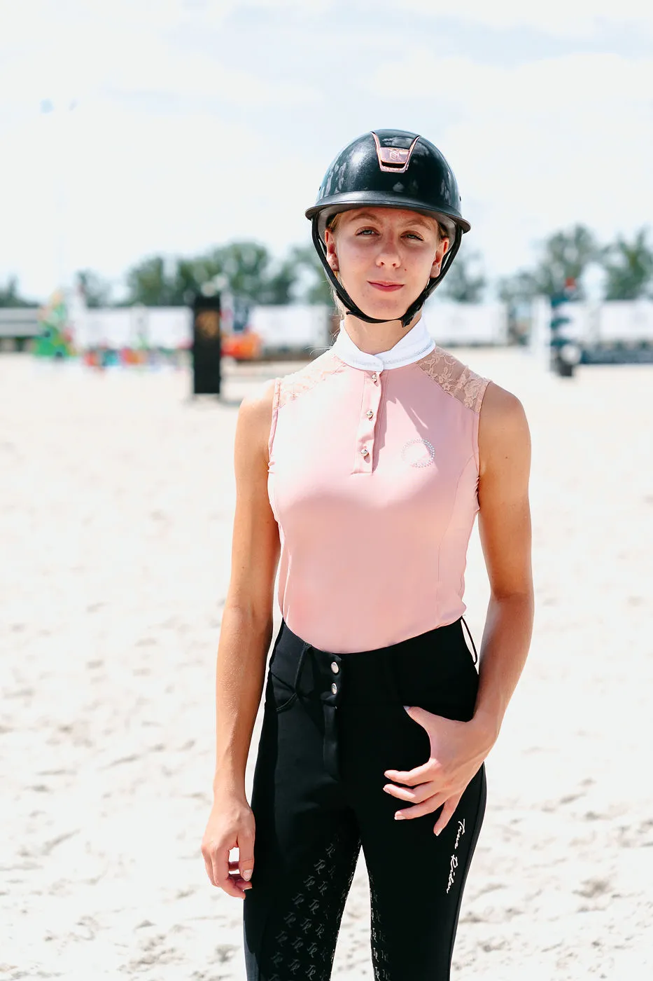 Opcja bez rękawów była moim faworytem :) wiem, że nie każdy uważa koszulę konkursową bez ramion za elegancką, ale pod frakiem i tak nie widać, że nie ma rękawów a np. dla nas ujeżdżeniowców jest zbawieniem podczas upalnych startów :P Uwielbiam też w niej jeździć na codziennych treningach (w wersji z ciemnym kołnierzem) - jest mi znacznie chłodniej, a dzięki niezwykłej koronce i detalom czuję się w niej ultra elegancko.
