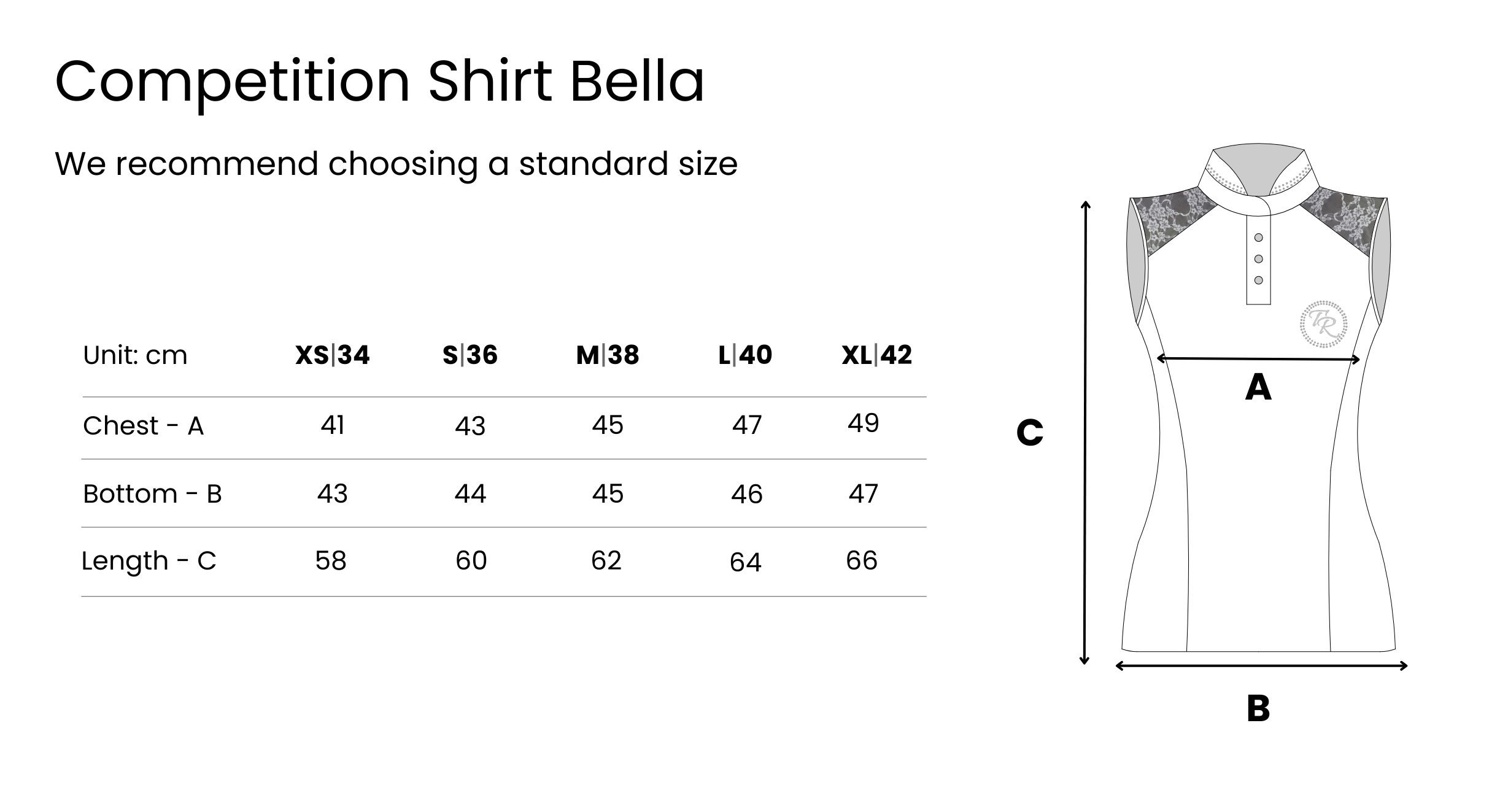 Zdecydowanie najbardziej efektywnym elementem koszuli konkursowej Bella jest połączenie sportowej tkaniny z niebywale elegancką koronką bo obu stronach ramion. Dodatkowej elegancji dodają trwałe, delikatne kryształki na stójce. Ich rozmiar nie przytłacza, a sprawia, że koszula konkursowa Bella ma w sobie to coś ;) Zwłaszcza, że diamenciki doskonale komponują się z przepięknymi, już nieco większymi srebrnymi guzikami.