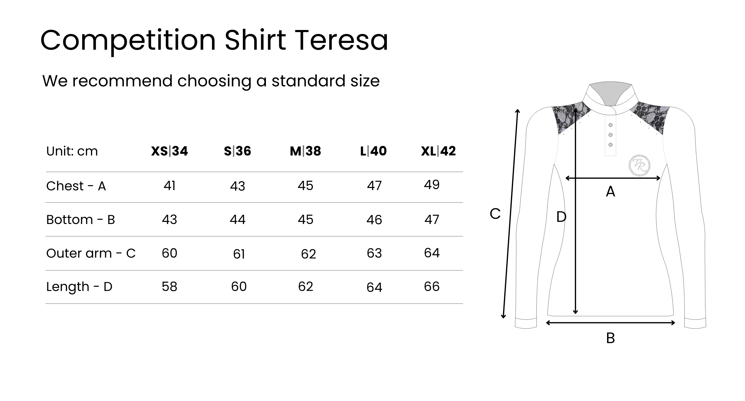 Zdecydowanie najbardziej efektywnym elementem koszuli konkursowej Teresa jest połączenie sportowej tkaniny z niebywale elegancką koronką. Wzdłuż obojczyków, zaraz obok koronki koszulę zdobią delikatnie mieniące się diamenciki. Z drugiej strony, jako sportowcy, których priorytetem jest pełny focus na zawodach, nie możemy zapomnieć o konkretnych funkcjonalnościach. Zadbaliśmy o najwyższej jakości włoski, przewiewny materiał. Jego wyjątkowa elastyczność typu four-way stretch, zapewnia maksymalny komfort podczas konkursów i odpowiednie dopasowanie.