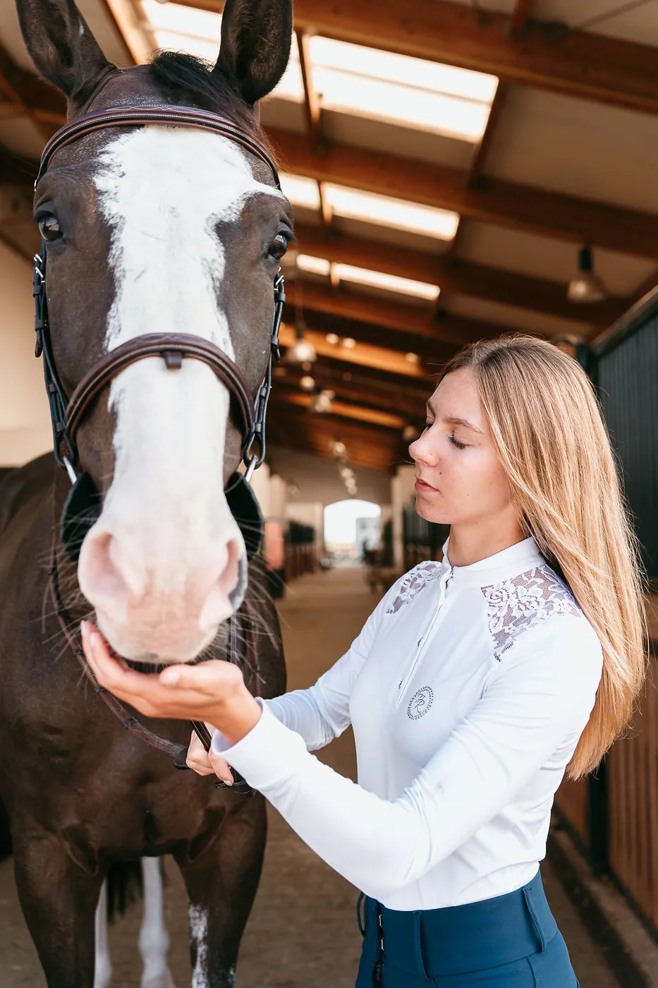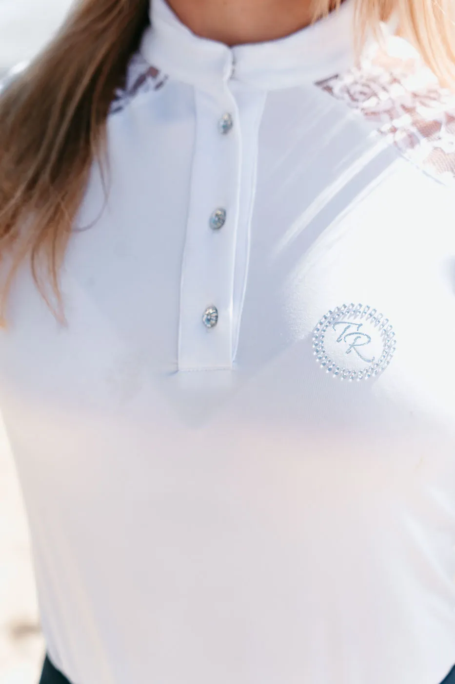 Zdecydowanie najbardziej efektywnym elementem koszuli konkursowej Teresa jest połączenie sportowej tkaniny z niebywale elegancką koronką. Wzdłuż obojczyków, zaraz obok koronki koszulę zdobią delikatnie mieniące się diamenciki. Z drugiej strony, jako sportowcy, których priorytetem jest pełny focus na zawodach, nie możemy zapomnieć o konkretnych funkcjonalnościach. Zadbaliśmy o najwyższej jakości włoski, przewiewny materiał. Jego wyjątkowa elastyczność typu four-way stretch, zapewnia maksymalny komfort podczas konkursów i odpowiednie dopasowanie.