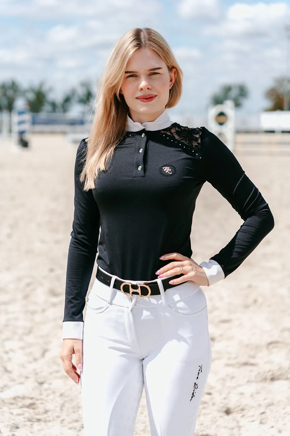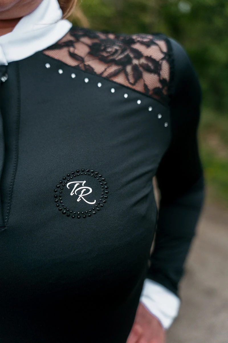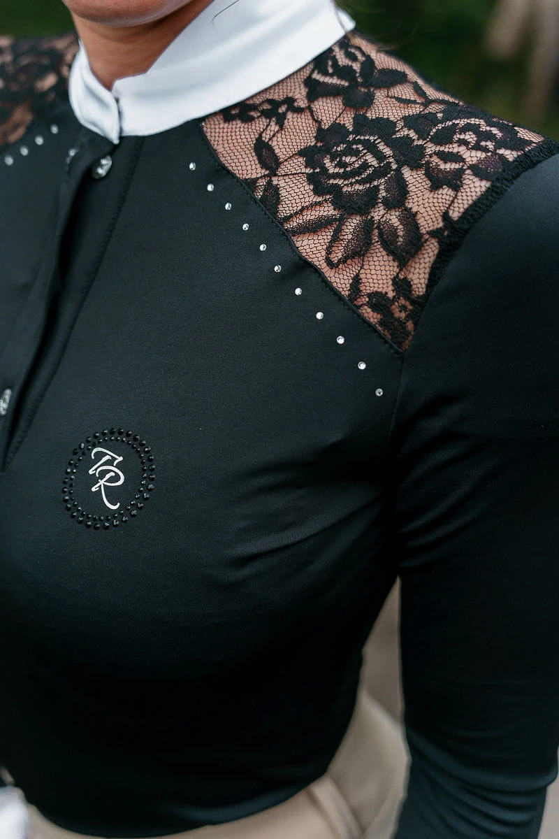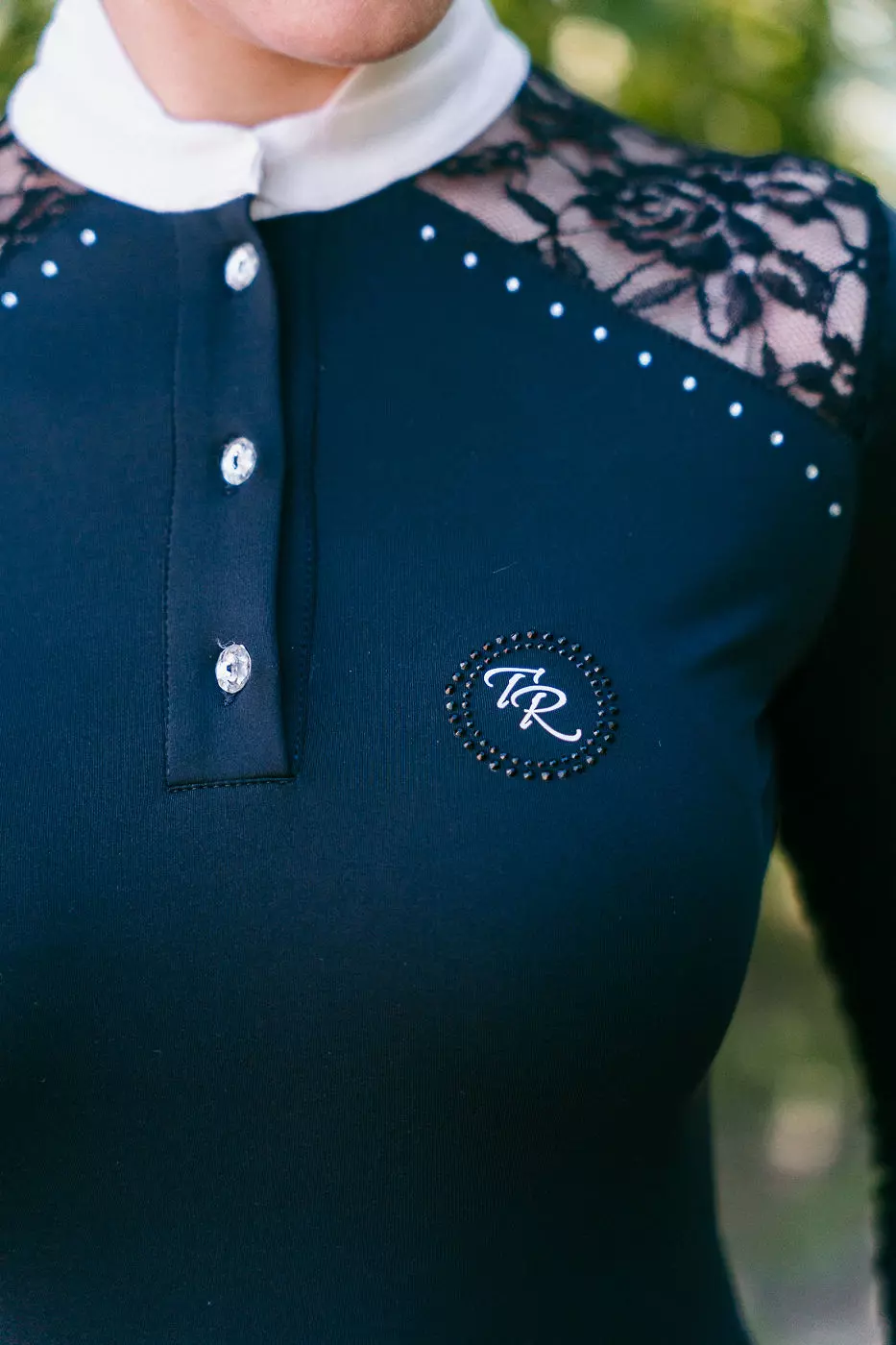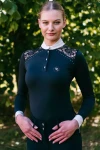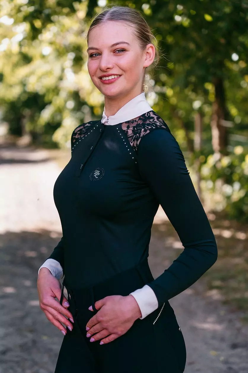 Zdecydowanie najbardziej efektywnym elementem koszuli konkursowej Teresa jest połączenie sportowej tkaniny z niebywale elegancką koronką. Wzdłuż obojczyków, zaraz obok koronki koszulę zdobią delikatnie mieniące się diamenciki. Z drugiej strony, jako sportowcy, których priorytetem jest pełny focus na zawodach, nie możemy zapomnieć o konkretnych funkcjonalnościach. Zadbaliśmy o najwyższej jakości włoski, przewiewny materiał. Jego wyjątkowa elastyczność typu four-way stretch, zapewnia maksymalny komfort podczas konkursów i odpowiednie dopasowanie.