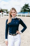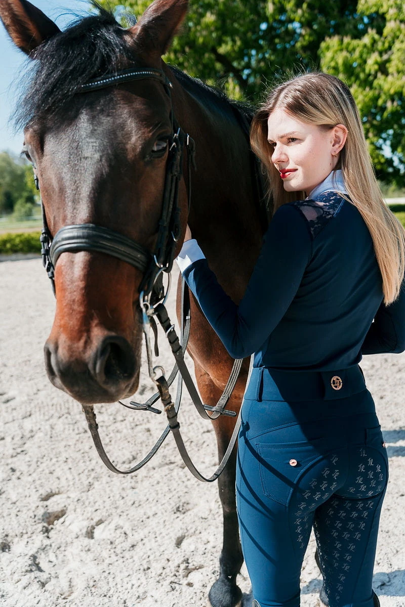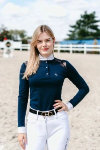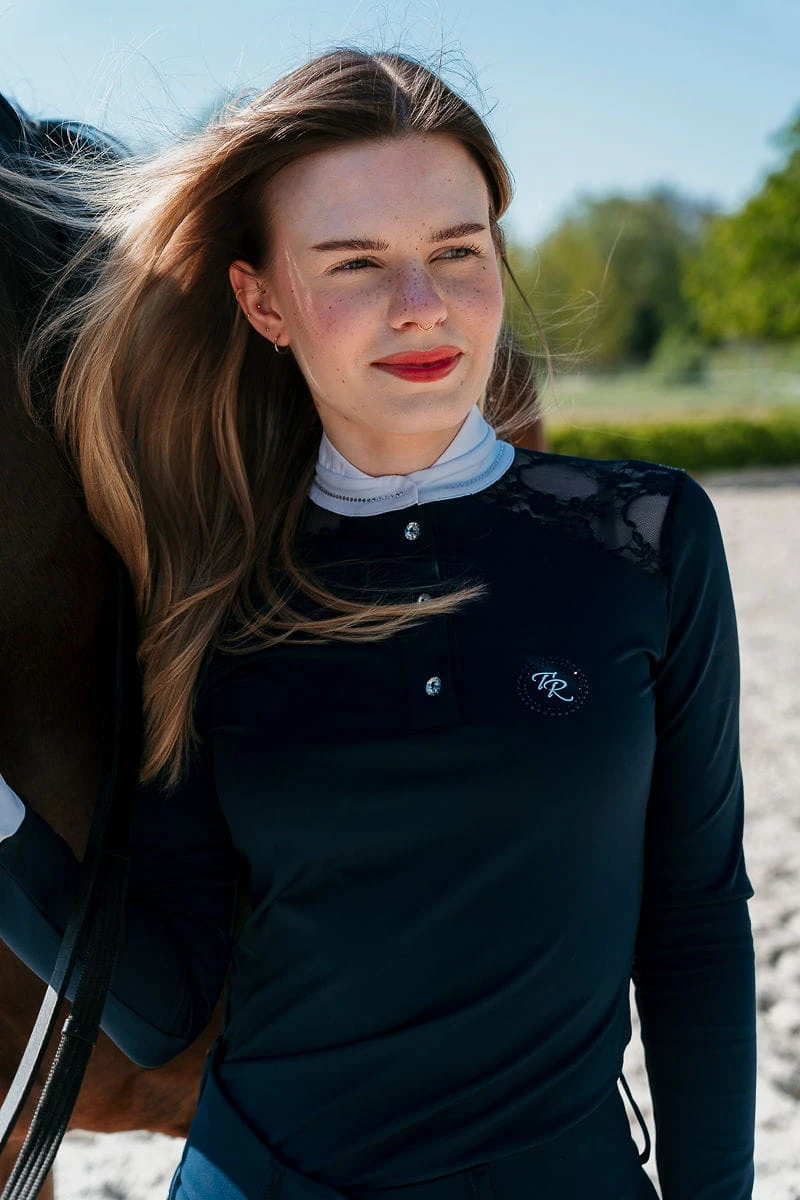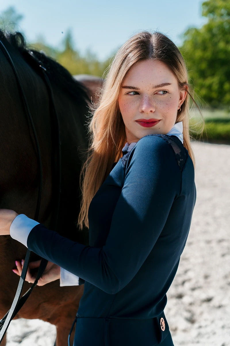Zdecydowanie najbardziej efektywnym elementem koszuli konkursowej Teresa jest połączenie sportowej tkaniny z niebywale elegancką koronką. Wzdłuż obojczyków, zaraz obok koronki koszulę zdobią delikatnie mieniące się diamenciki. Z drugiej strony, jako sportowcy, których priorytetem jest pełny focus na zawodach, nie możemy zapomnieć o konkretnych funkcjonalnościach. Zadbaliśmy o najwyższej jakości włoski, przewiewny materiał. Jego wyjątkowa elastyczność typu four-way stretch, zapewnia maksymalny komfort podczas konkursów i odpowiednie dopasowanie.