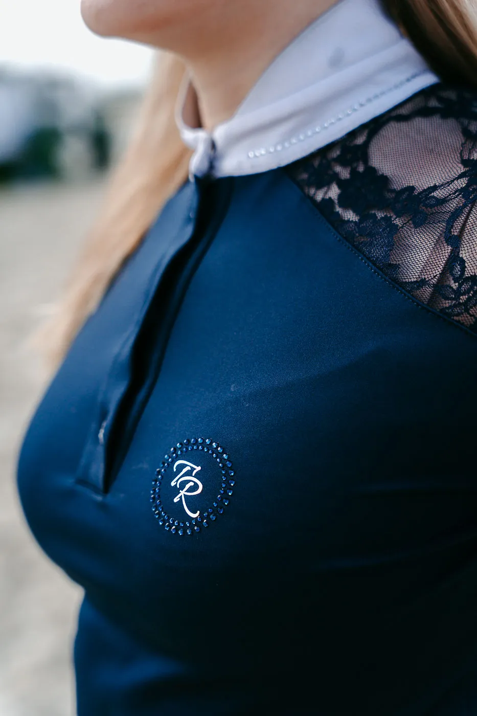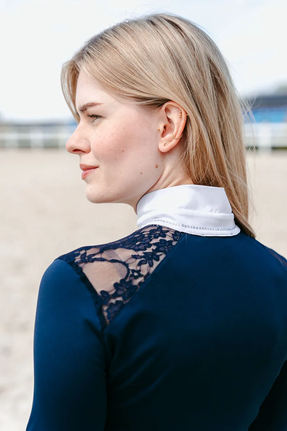 Zdecydowanie najbardziej efektywnym elementem koszuli konkursowej Teresa jest połączenie sportowej tkaniny z niebywale elegancką koronką. Wzdłuż obojczyków, zaraz obok koronki koszulę zdobią delikatnie mieniące się diamenciki. Z drugiej strony, jako sportowcy, których priorytetem jest pełny focus na zawodach, nie możemy zapomnieć o konkretnych funkcjonalnościach. Zadbaliśmy o najwyższej jakości włoski, przewiewny materiał. Jego wyjątkowa elastyczność typu four-way stretch, zapewnia maksymalny komfort podczas konkursów i odpowiednie dopasowanie.