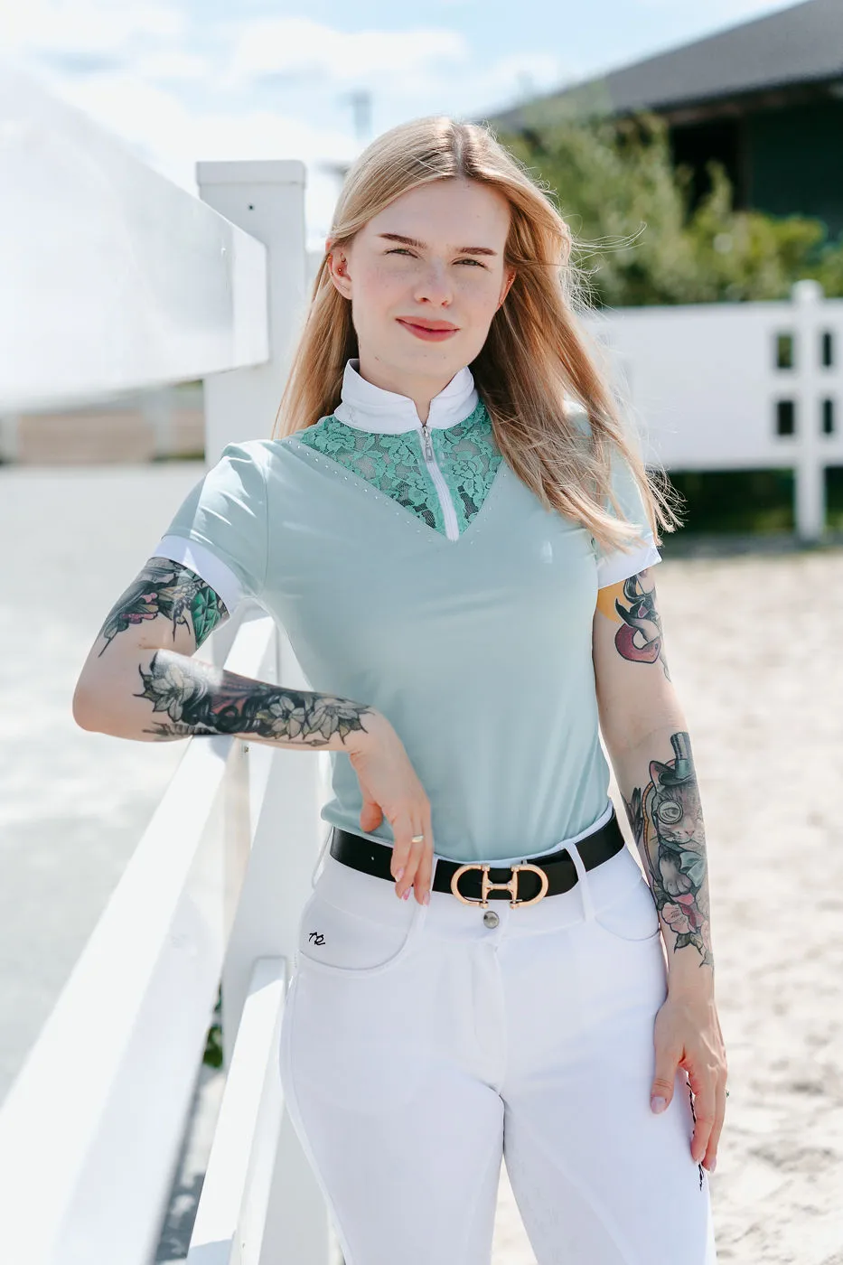 Zdecydowanie najbardziej efektywnym elementem koszuli konkursowej Viki jest połączenie sportowej tkaniny z niebywale elegancką koronką. Wzdłuż jej krawędzi znajdują się trwałe kryształki delikatnie mieniące się w świetle. Z drugiej strony, jako sportowcy, których priorytetem jest pełny focus na zawodach, nie możemy zapomnieć o konkretnych funkcjonalnościach. Zadbaliśmy o najwyższej jakości włoski, przewiewny materiał. Jego wyjątkowa elastyczność typu four-way stretch, zapewnia maksymalny komfort podczas konkursów i odpowiednie dopasowanie.