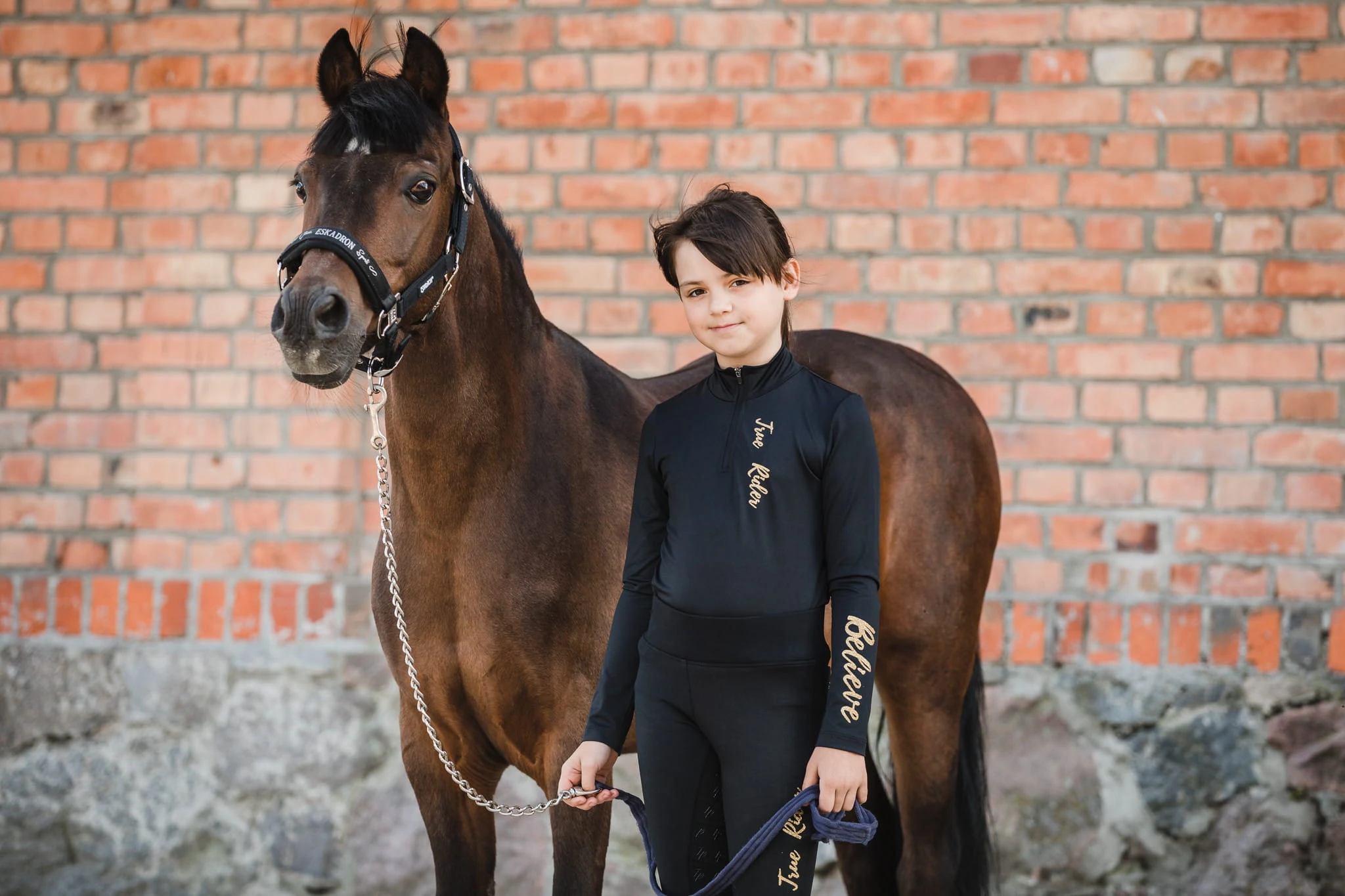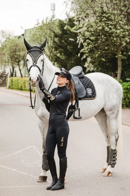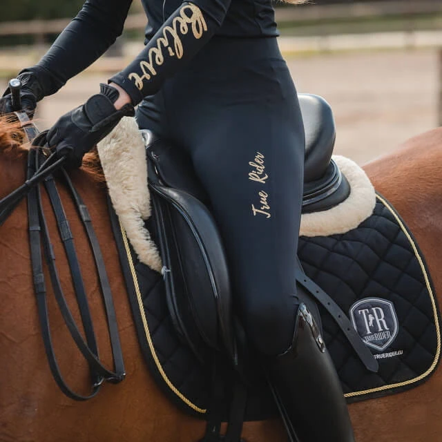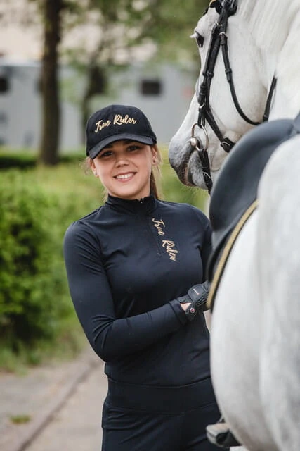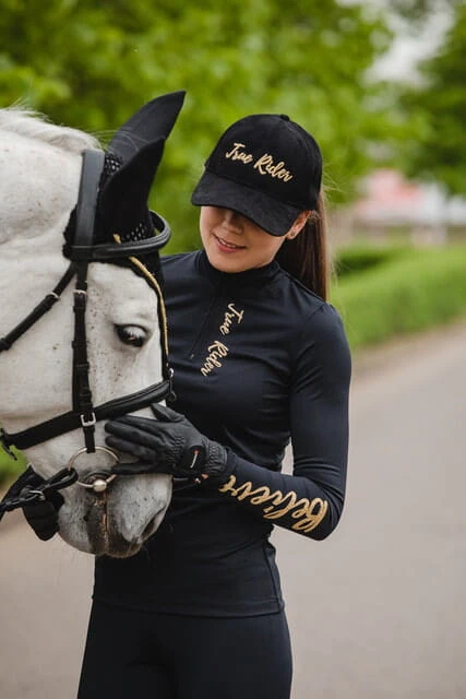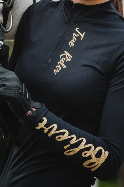 - Zapinany na zamek, wzdłuż którego dodaliśmy ozdobny kontrastowy nadruk True Rider. Koszulka Techniczna Black & Gold to idealne uzupełnieni kolekcji Black & Gold, w której znajdziecie kamizelkę, legginsy jeździeckie, czapeczkę z daszkiem, a nawet czaprak oraz nauszniki dla swego rumaka!