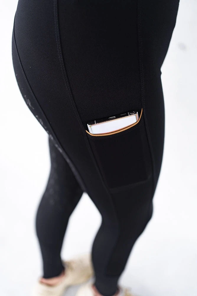 - Praktyczna, bezszwowa kieszeń z boku lewej nogi, która jest idealna na telefon, klucze i końskie smaczki