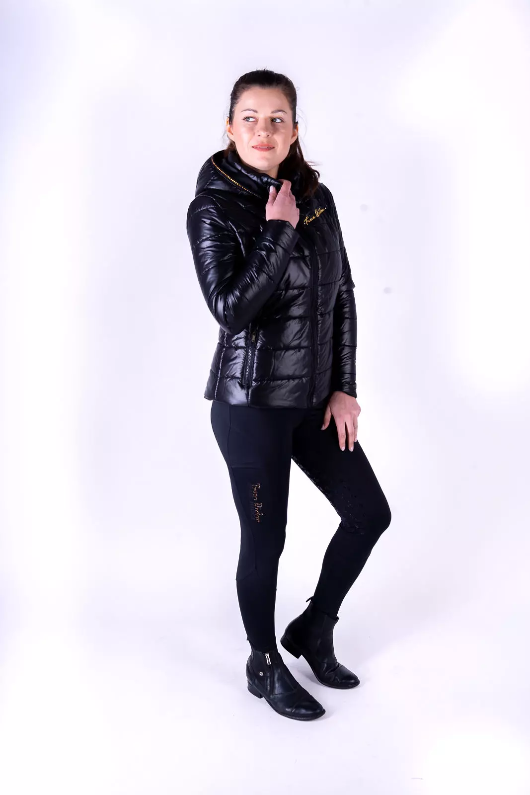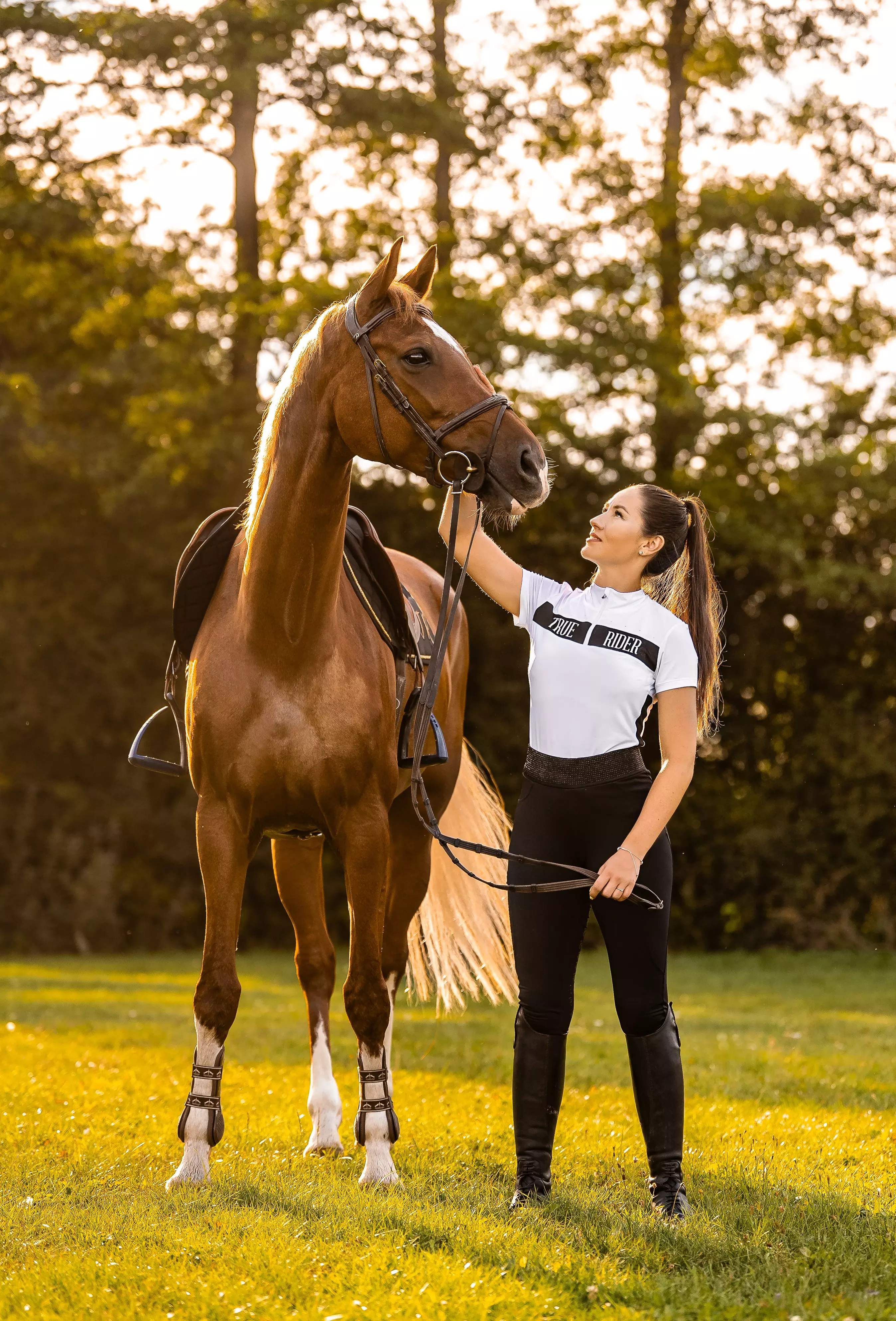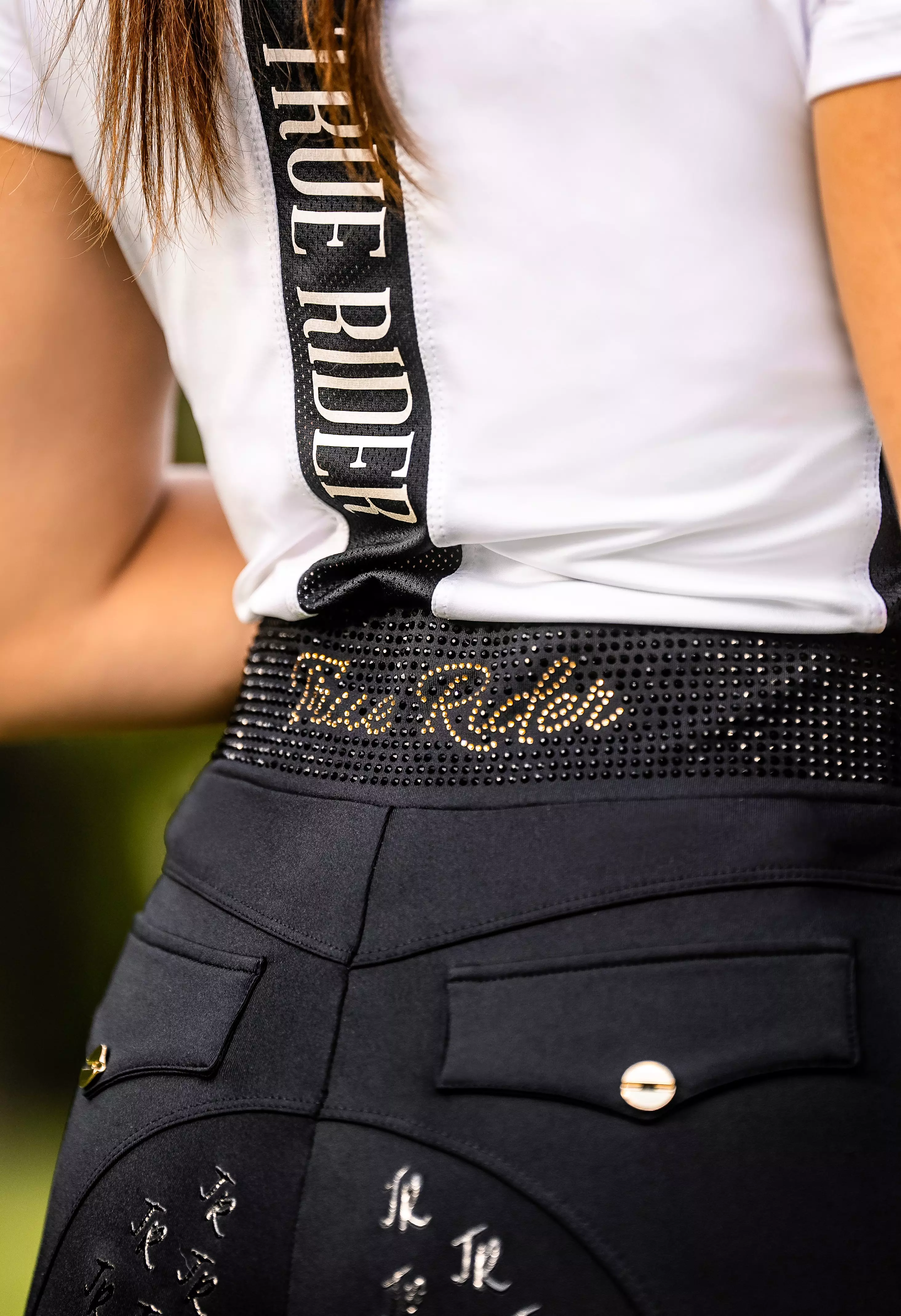Wszystkie kochamy błyszczeć! Czemu by więc nie dodać szczypty blasku do naszych najnowszych, bestsellerowych Legginsów Marta? Zwróć uwagę na ten piękny diamencikowy pas! W całości ozdobiony diamencikami w kolorze tkaniny z wkomponowanym napisem True Rider w kolorze złotym. Idealnie pasujący do kolekcji Black & Gold. Połącz wygodę z ekstrawagancją i każdego dnia olśniewaj w stajni :D