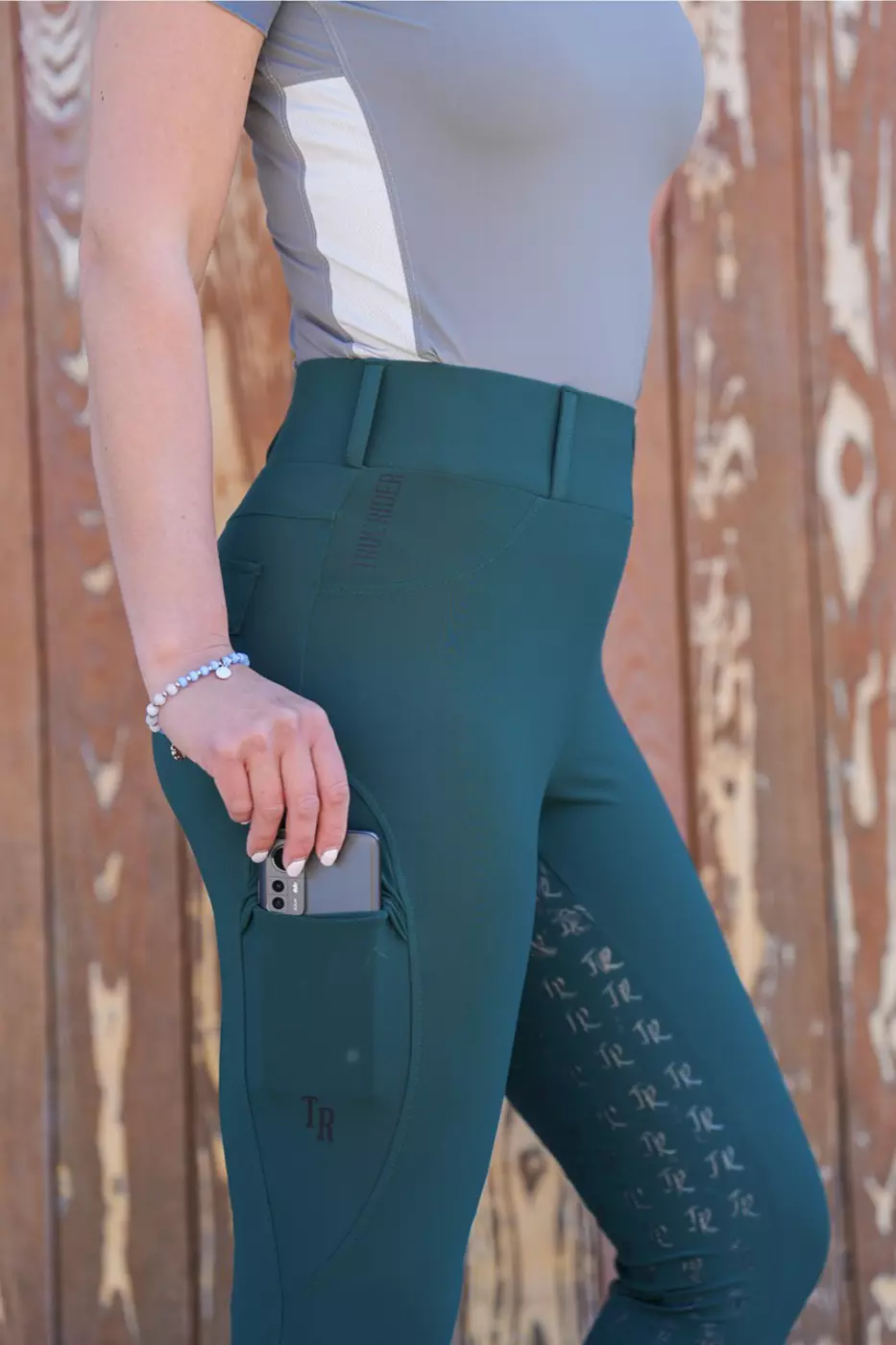 - NOWOŚĆ: praktyczna, zamykana od góry dodatkowym materiałem kieszeń na telefon z boku lewej nogi, która jest idealna na telefon, klucze i końskie smaczki