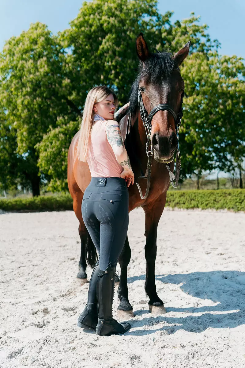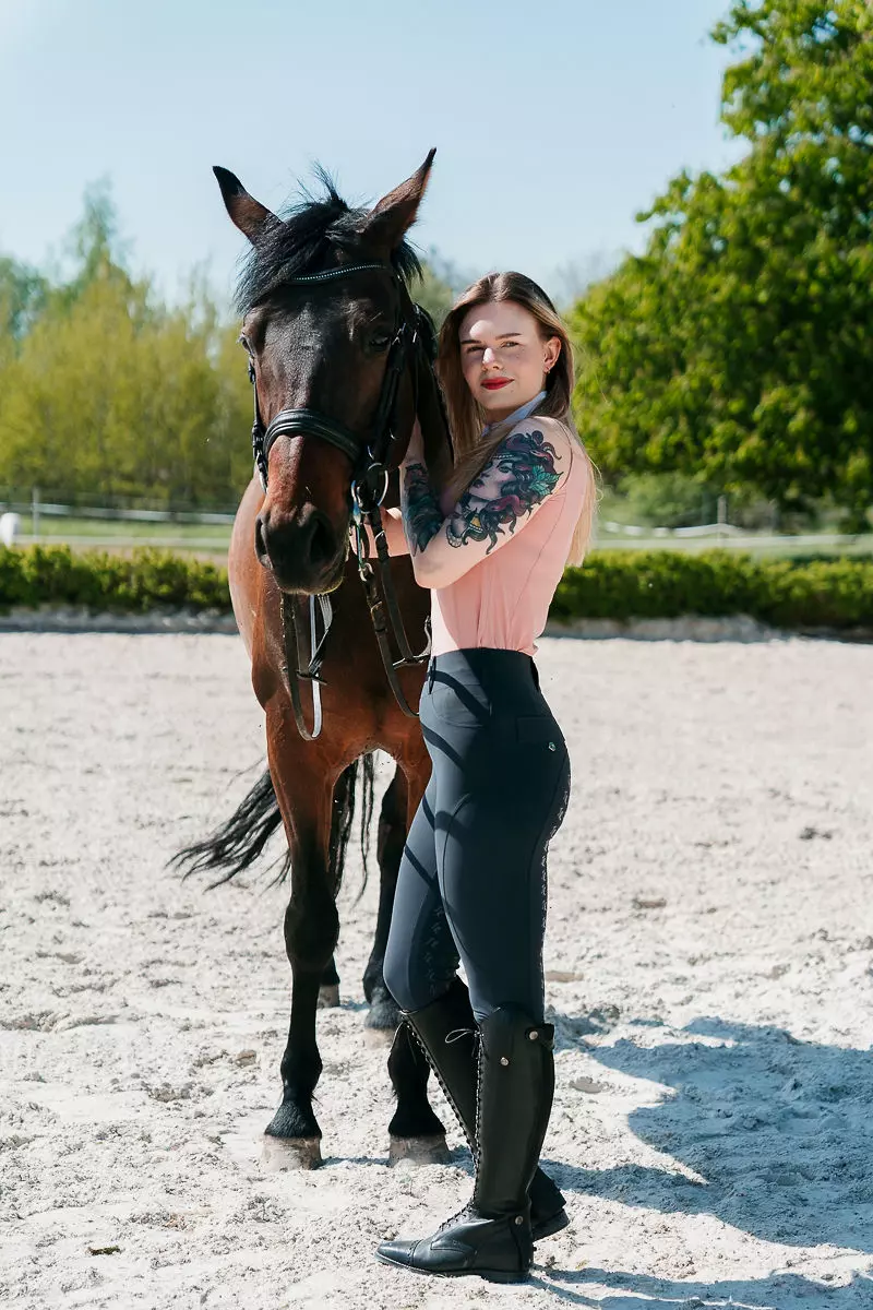 Legginsy Marta wykonane ze szczególnie elastycznej, najwyższej jakości tkaniny, która idealnie dopasuje się do kształtów Twojej sylwetki. Ich wysoki stan ładnie wysmukla talię, nie ograniczając jednocześnie ruchów w siodle. Idealnie rozwiązanie dla amazonek ceniących sobie świetny wygląd i elegancję w połączeniu z maksymalnym komfortem.