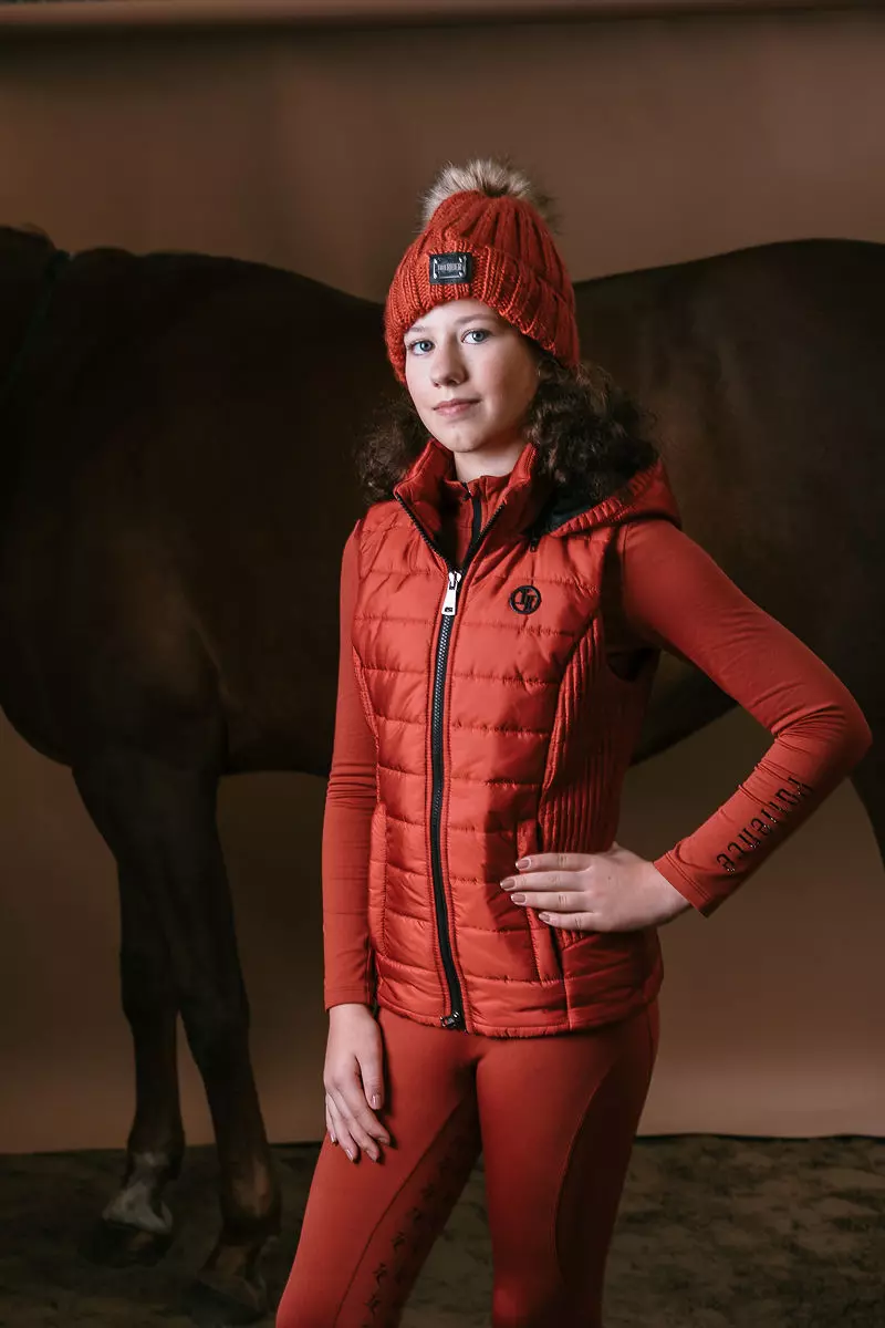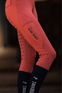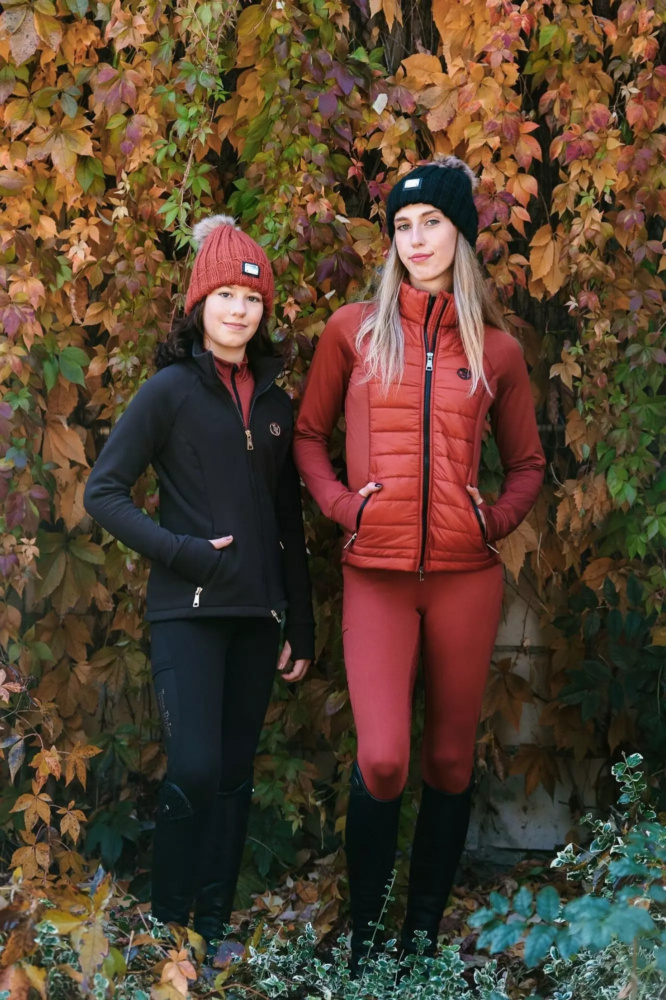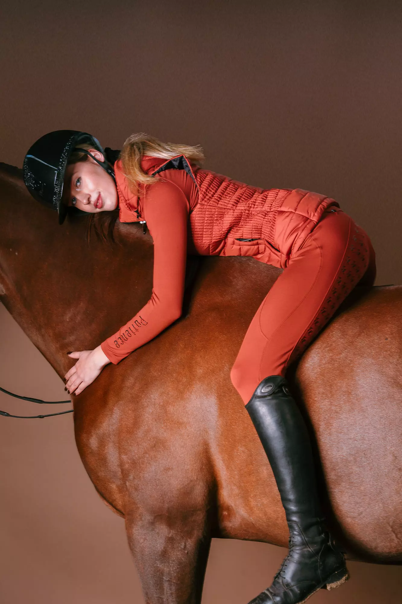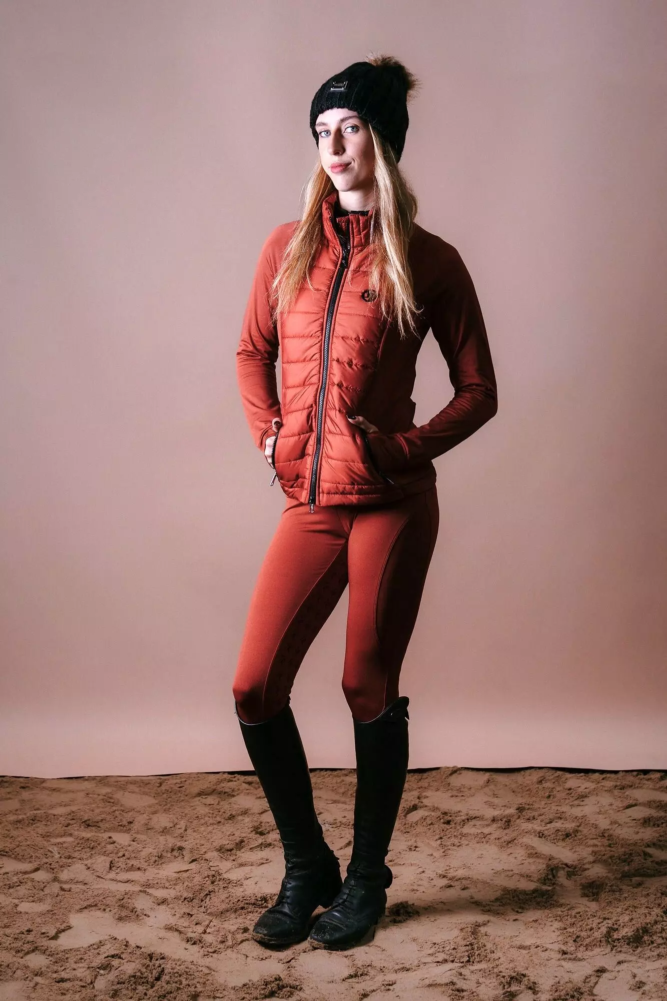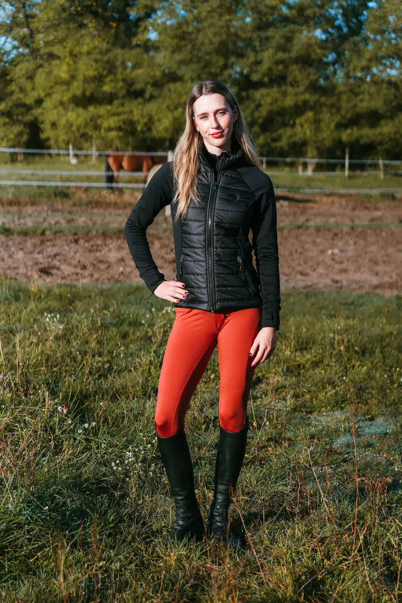 - Wykonane z grubszego, ale wygodne i elastycznego materiału z efektem termicznym, który zapewnia komfort i ciepło podczas jazdy konnej i innych aktywności w stajni