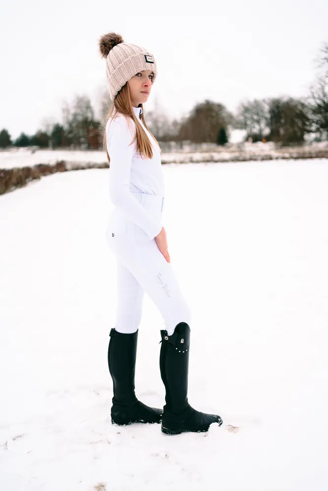 - Konkursowa wersja zimowych legginsów w kolorze białym - koniec marznięcia na zawodach halowych! Wykonane z grubszego, ale wygodne i elastycznego materiału z efektem termicznym, który zapewnia komfort i ciepło podczas jazdy konnej i innych aktywności w stajni