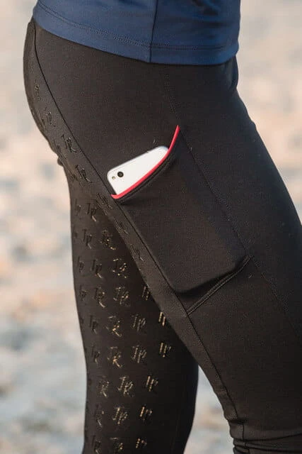 - Praktyczna, bezszwowa kieszeń z boku lewej nogi, która jest idealna na telefon, klucze i końskie smaczki – możesz jeździć w t-shircie bez obawy, że posiejesz gdzieś swoje rzeczy.
