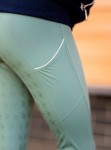- Praktyczna, bezszwowa kieszeń z boku lewej nogi, która jest idealna na telefon, klucze i końskie smaczki – możesz jeździć w t-shircie bez obawy, że posiejesz gdzieś swoje rzeczy.