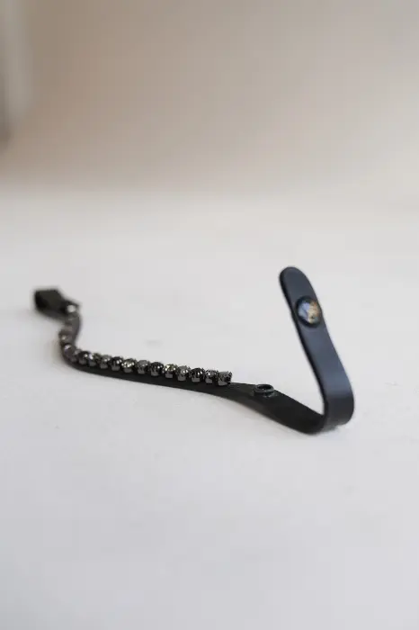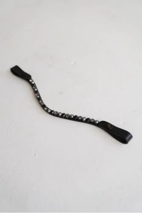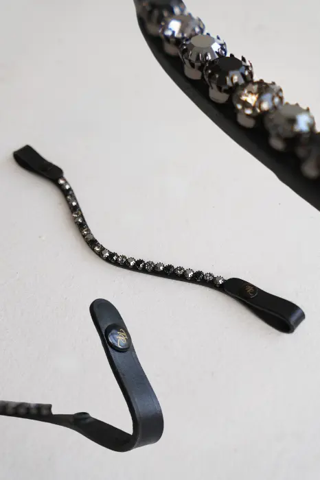 Skórzany niezwykle uroczy, opadający naczółek z mieniącymi się kryształkami w kolorze czarno-grafitowym.