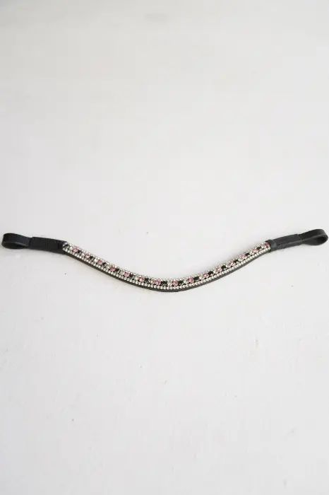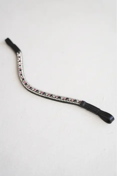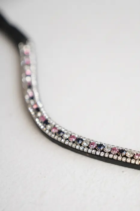 Skórzany niezwykle uroczy, opadający naczółek z mieniącymi się kryształkami w kolorze różowo-srebrnym.