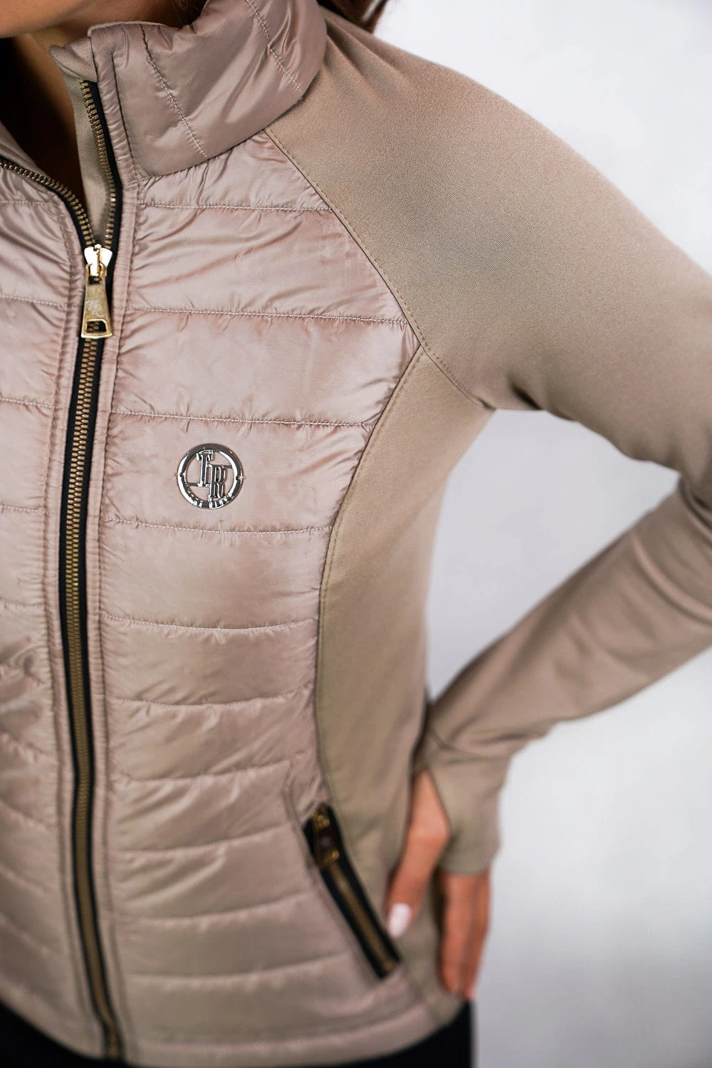 - Przód i tył wykonany z błyszczącej wytrzymałej tkaniny z lekką ociepliną, która zatrzymuje ciepło, jednocześnie dając pełną swobodę podczas aktywności