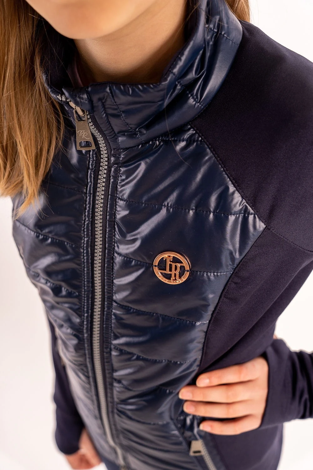 - Przód i tył wykonany z błyszczącej wytrzymałej tkaniny z lekką ociepliną, która zatrzymuje ciepło, jednocześnie dając pełną swobodę podczas aktywności