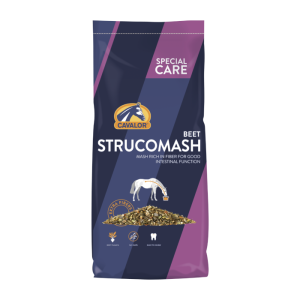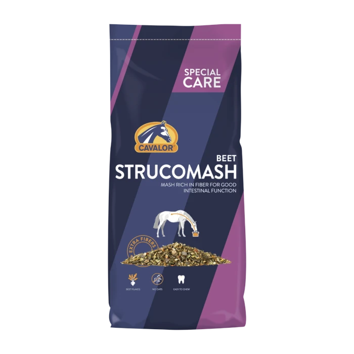 Cavalor Strucomash Beet bazuje na wysłodkach buraczanych, które są źródłem łatwostrawnego włókna i naturalnej energii dla koni o wrażliwym żołądku. Połączono je z sieczką z lucerny i traw Timothy, co wspiera żucie i wydzielanie śliny, a tym samym chroni błonę śluzową żołądka przed nadkwaśnością. Pasza została wzbogacona o drożdże piwne, siemię lniane, olej roślinny oraz komplet witamin i minerałów, które wspomagają odporność, zdrowie kopyt, skóry i sierści.