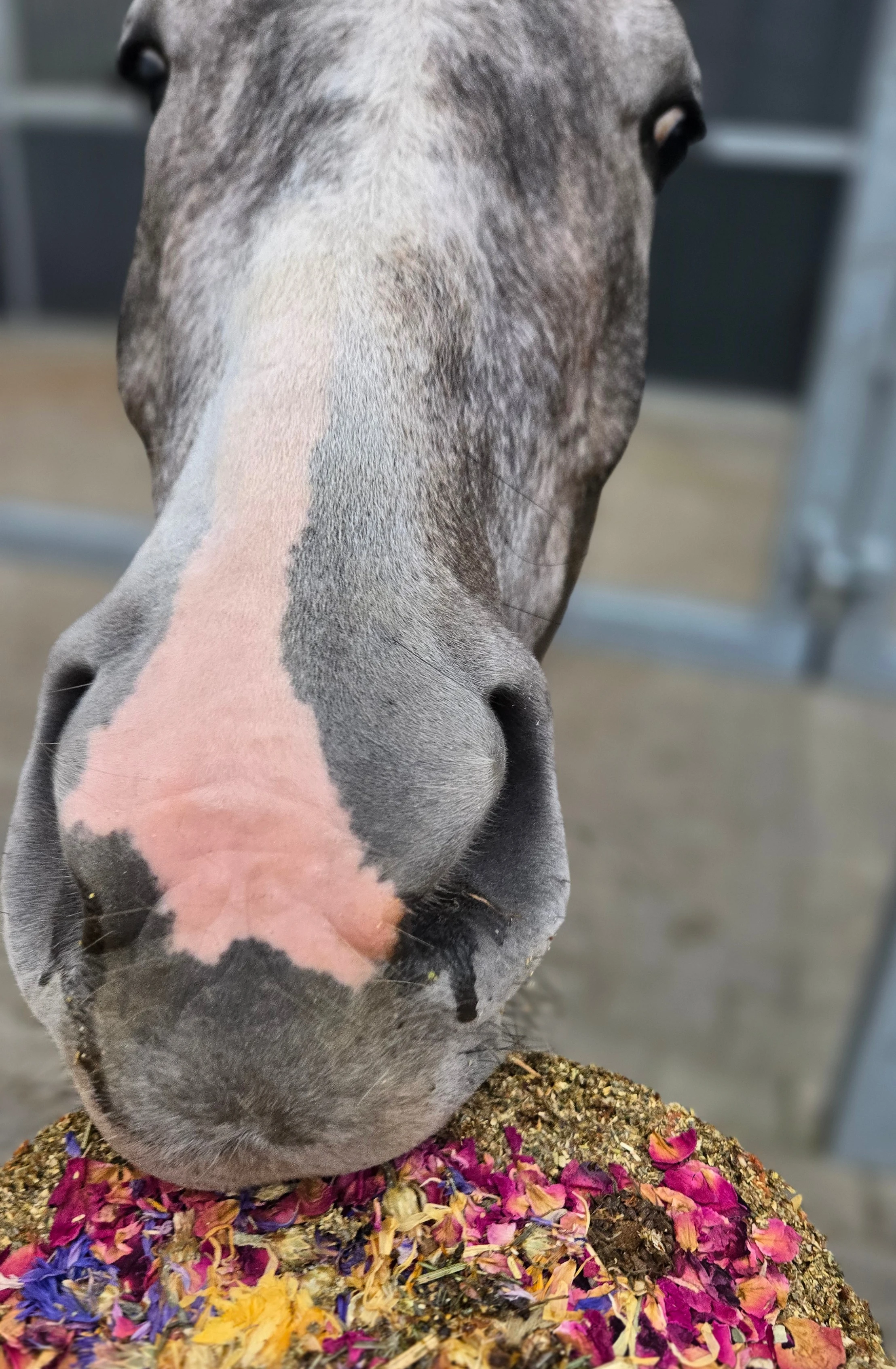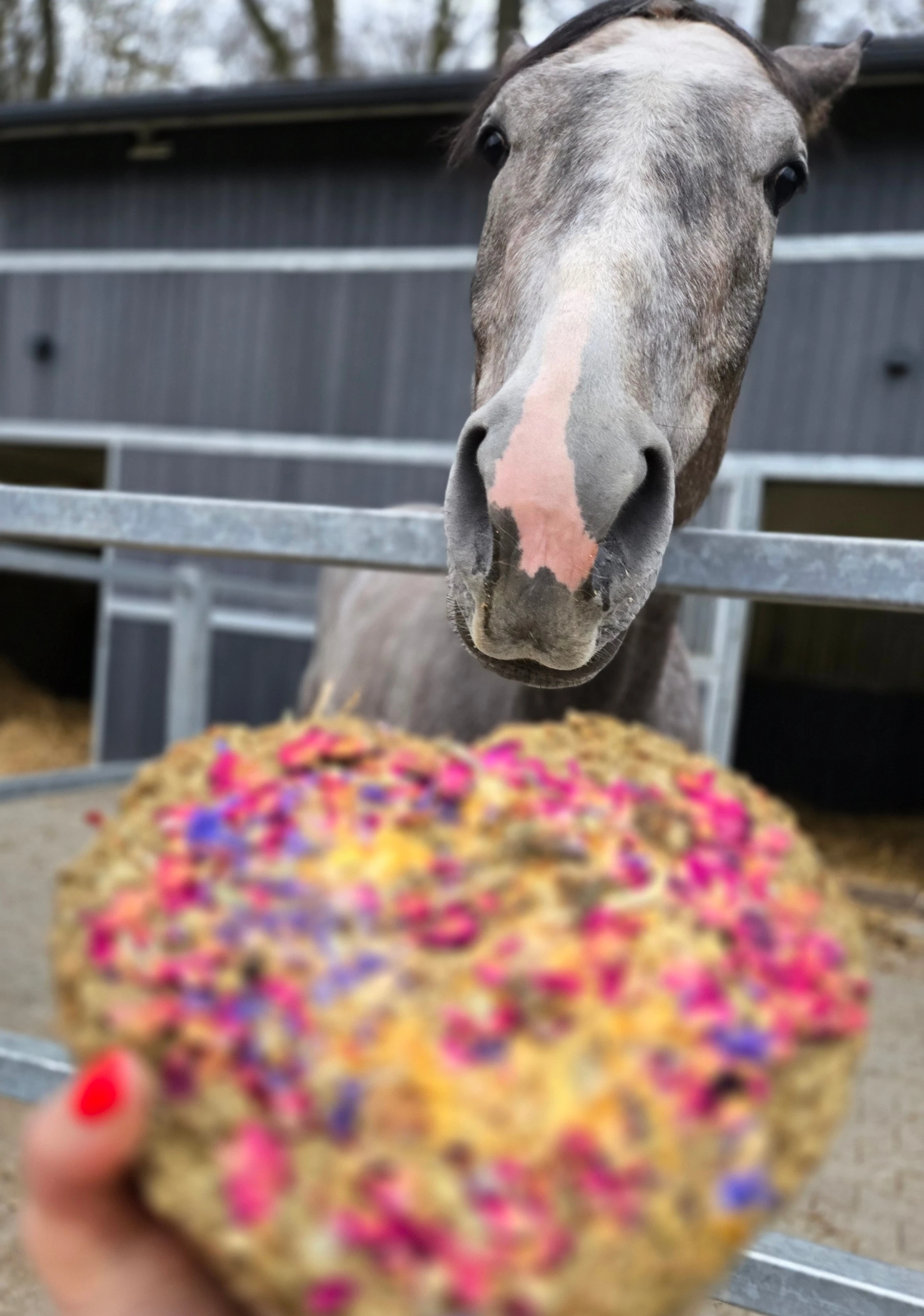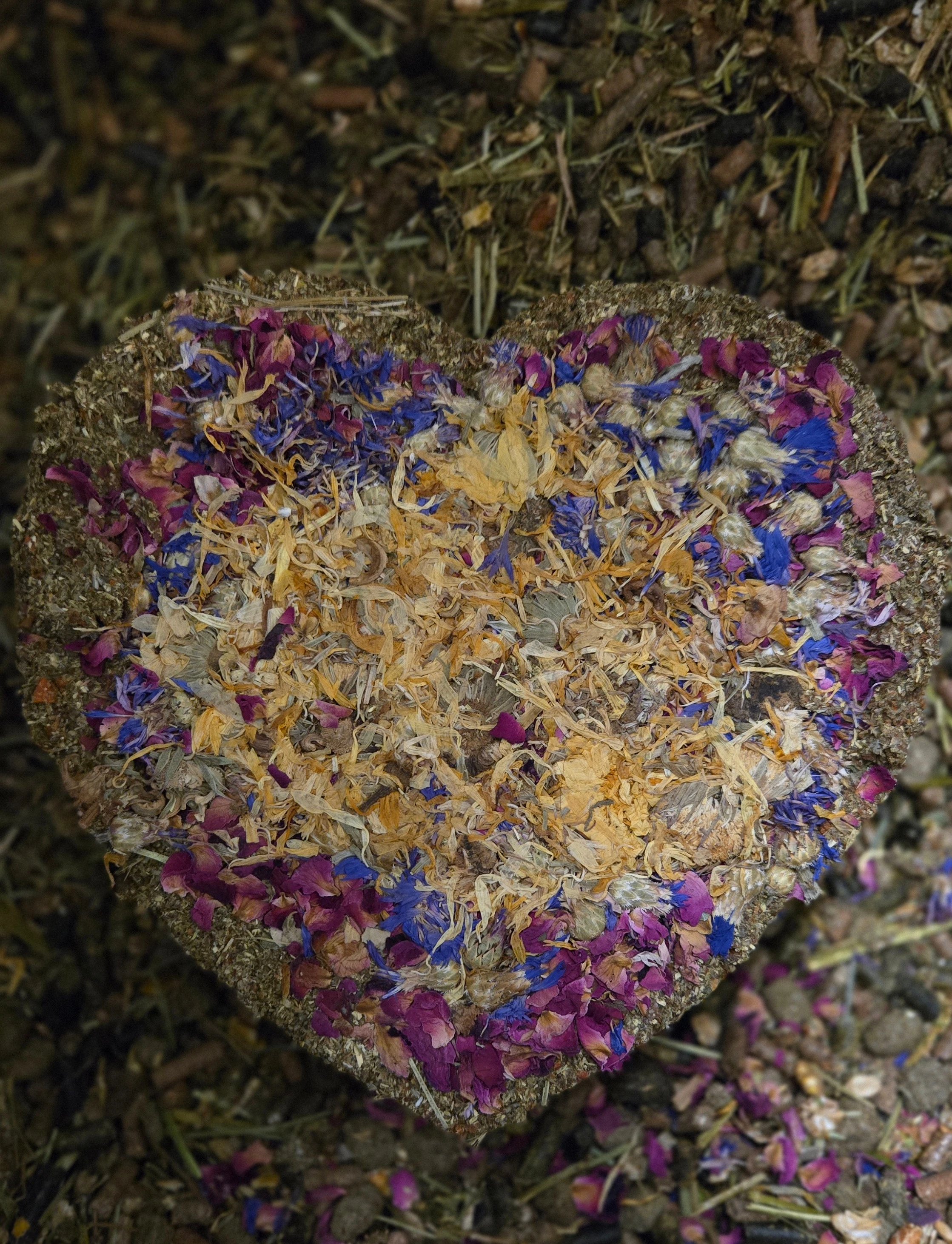 Kwiatowe Serce to pachnące ziołami i kwiatami ciacho dla koni wykonane wyłącznie z naturalnych surowców roślinnych. Produkt powstał jako bezpieczna nagroda dla koni z wrażliwym układem pokarmowym, skłonnością do wrzodów oraz dla koni sportowych wymagających stabilnej, niskocukrowej przekąski.