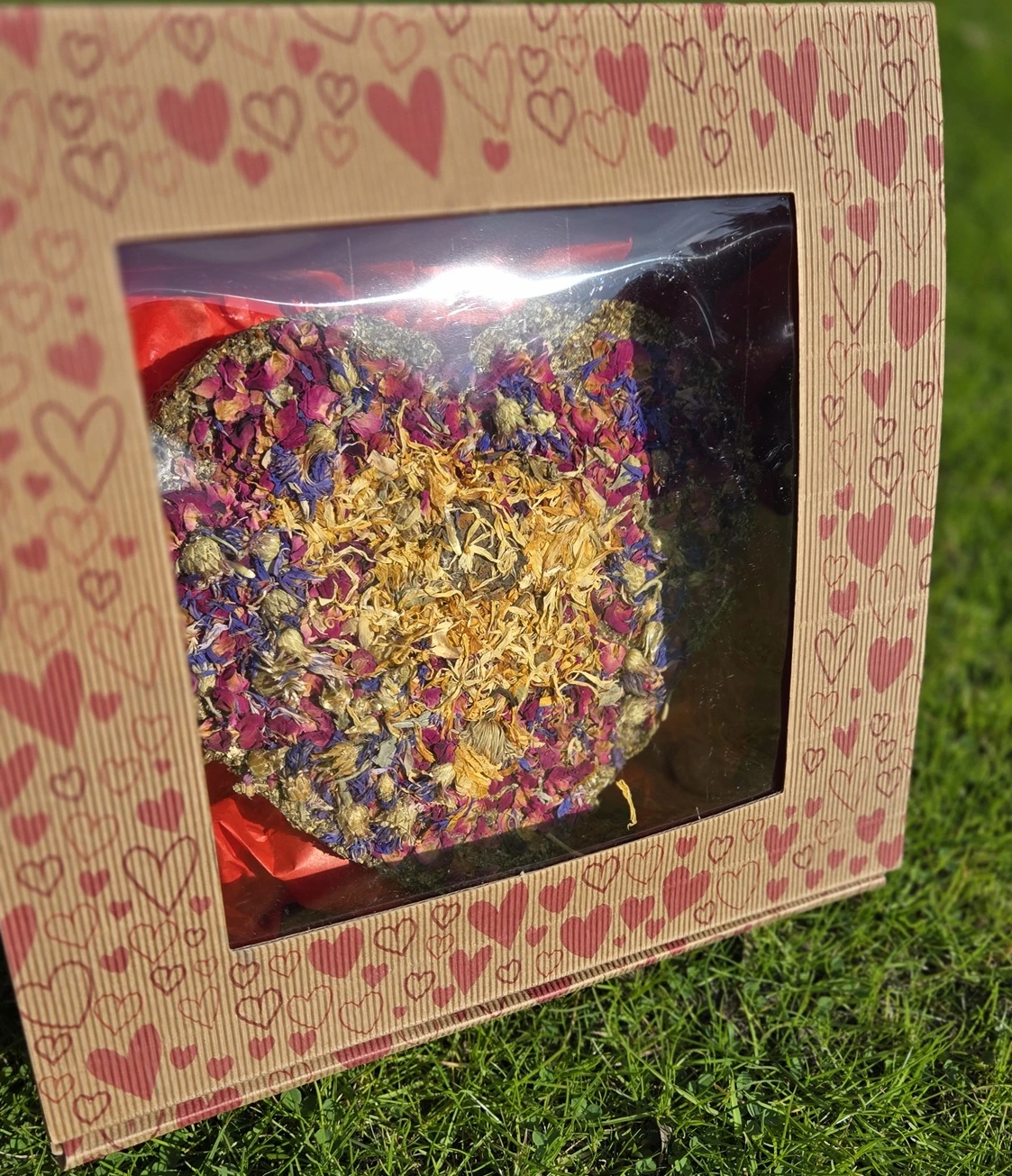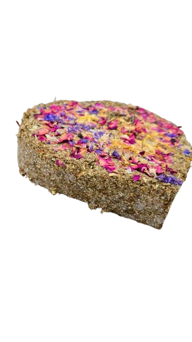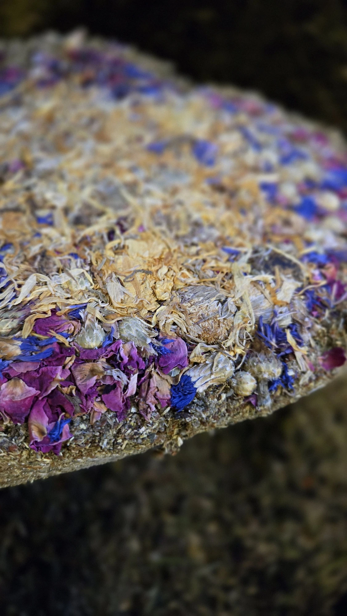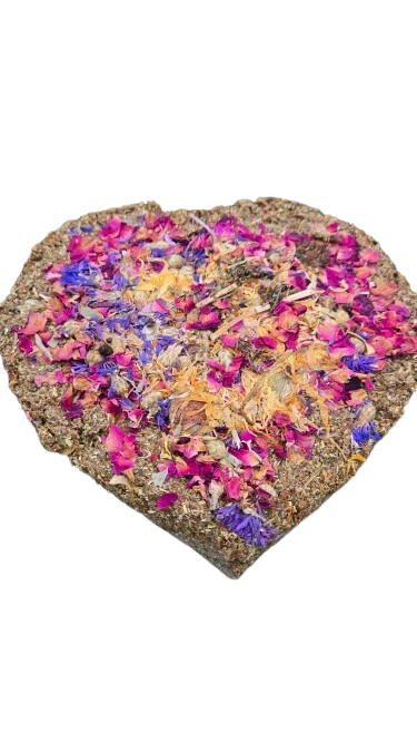 Kwiatowe Serce to pachnące ziołami i kwiatami ciacho dla koni wykonane wyłącznie z naturalnych surowców roślinnych. Produkt powstał jako bezpieczna nagroda dla koni z wrażliwym układem pokarmowym, skłonnością do wrzodów oraz dla koni sportowych wymagających stabilnej, niskocukrowej przekąski.