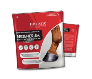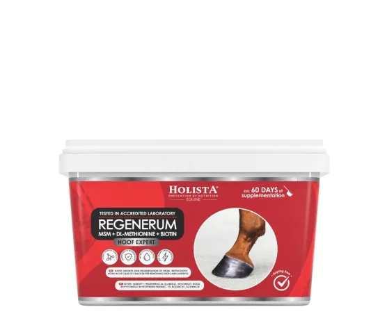 HolistaEquine Hoof Expert Regenerum to zaawansowany preparat dietetyczny dla koni, który wspiera szybki wzrost i regenerację kopyt. Dzięki zwiększonej zawartości substancji aktywnych przyspiesza proces keratynizacji, co skutkuje odbudową mocnego, elastycznego i zdrowego rogu kopytowego. To idealne rozwiązanie dla koni ze słabymi, kruchymi lub łamliwymi kopytami oraz jako wsparcie profilaktyczne u koni sportowych i rekreacyjnych.