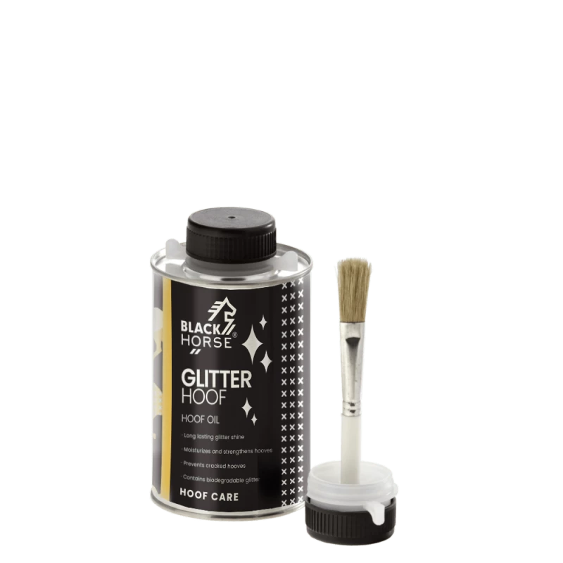 GLITTER HOOF OIL to olej do kopyt wzbogacony drobinkami brokatu biodegradowalnego. Ich obecność sprawia, że kopyta pięknie mienią się na słońcu. Olej nawilża i odżywia kopyto zapewniając jego sprężystość i wygładzenie. Zapobiega pękaniu kopyt i wzmacnia ich strukturę. Olejowa formuła doskonale nabłyszcza kopyta nadając im długotrwały połysk. Dzięki luźnej konsystencji, olej nie tworzy na kopycie smug.