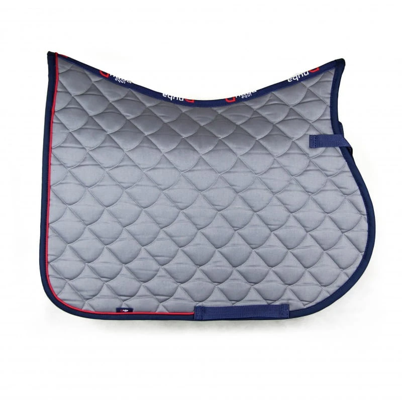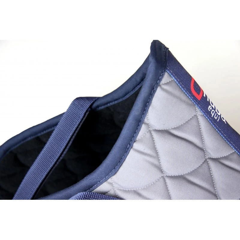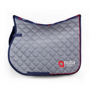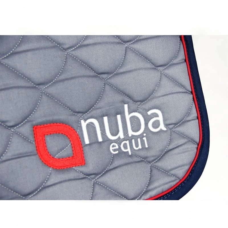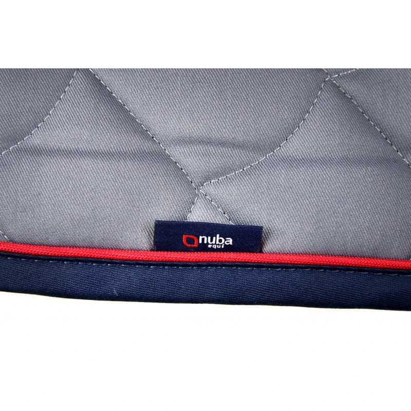 Stylowy i funkcjonalny czaprak jeździecki Nuba Equi w kolorze szarym z granatową lamówką i elegancką czerwoną wypustką. Wyposażony w logo Nuba Equi wyhaftowane z jednej strony – na drugiej stronie pozostawiono miejsce do wyszycia własnego imienia, logotypu stajni lub drużyny. Model wszechstronny/skokowy (VS) w rozmiarze full, idealny na codzienne treningi i zawody.