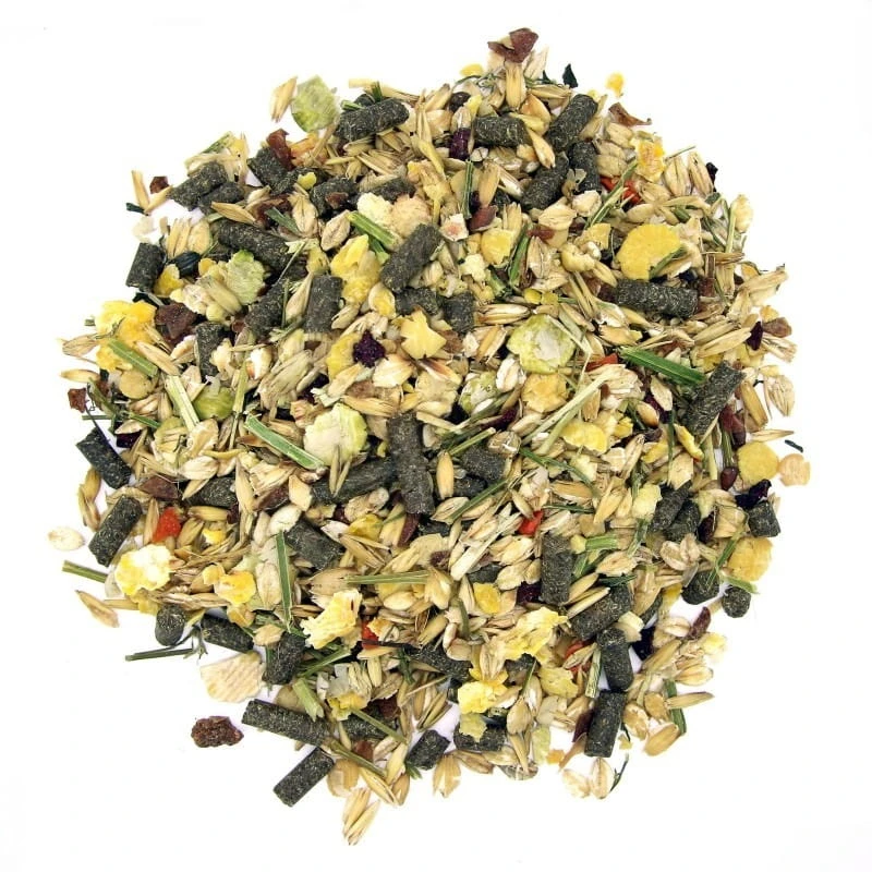 Zgodnie z kartą produktu (m.in. lucerna, mikronizowane zboża, siemię lniane, makuch lniany, drożdże, olej lniany; energia strawna ok. 12,4 MJ/kg; białko 179 g/kg; lizyna 10,6 g/kg; skrobia ok. 19,3%; mikroelementy w formie chelatów; wit. A jako beta-karoten, podwyższona wit. E).