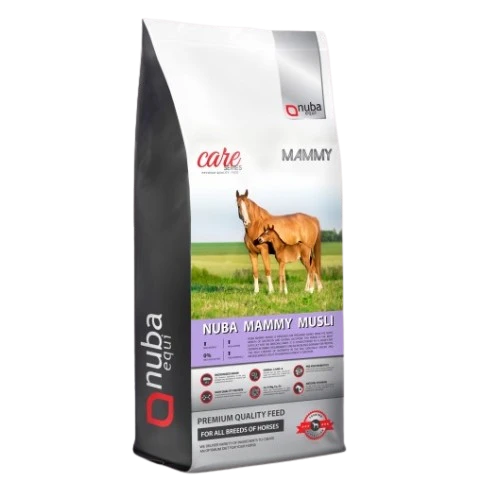 Nuba Mammy Musli Balancer 2G to skoncentrowany balancer do łączenia z sianem oraz paszami gospodarskimi (np. owsem, wysłodkami). Opracowany specjalnie na najbardziej wymagający okres – końcówkę ciąży i laktację – zapewnia kompletną podaż witamin, makro- i mikroelementów, aminokwasów i energii wspierającej obfitą laktację, prawidłowy rozwój płodu i szybkie dojście klaczy do formy po porodzie. Bazuje m.in. na lucernie, komponentach włóknistych, oleju lnianym i drożdżach z probiotykiem, aby wspierać trawienie, odporność i stabilną energię.
