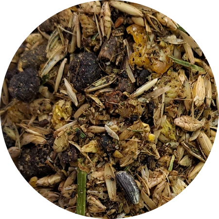 SKŁAD: płatki jęczmienne mikronizowane, miazga jabłkowa suszona, płatki kukurydziane mikronizowane, otręby ryżowe, lucerna suszona, otręby pszenne, olej rzepakowy, płatki nasion soi, melasa buraczana, fosforan jednowapniowy, marchew suszona, nasiona słonecznika, burak czerwony, pasternak, topinambur, chlorek sodu, kwiat nagietka, nasiona kozieradki, liść babki lancetowatej, węglan wapnia, tlenek magnezu, czerwone wapienne algi (lithothamne)