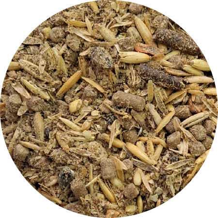 otręby ryżowe, płatki z nasion soi, łuski nasion soi, otręby pszenne, miazga jabłkowa suszona, makuch z siemienia lnianego, nasiona słonecznika, chleb świętojański suszony, marchew suszona, węglan wapnia, melasa buraczana, susz z kwiatów konopi siewnej z naturalną zawartością CBD, olej sojowy, dzika róża, miłorząb, mniszek lekarski, tymianek, kozieradka, krwawnik, chlorek sodu, tlenek magnezu, czerwone wapienne algi (lithothamne)