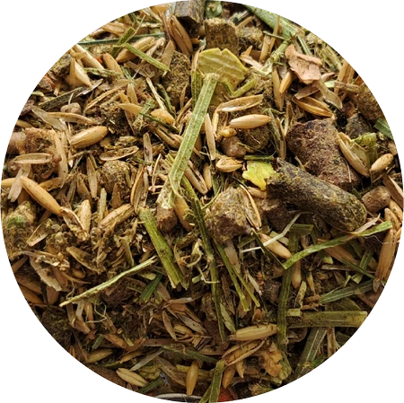 lucerna suszona, otręby ryżowe, miazga jabłkowa suszona, otręby pszenne, makuch z siemienia lnianego, płatki nasion soi, chleb świętojański suszony, nasiona słonecznika, płatki grochowe (groch zielony), olej sojowy, melasa buraczana, marchew suszona, owoc dzikiej róży, burak czerwony, mniszek lekarski, tymianek, kwiat koniczyny czerwonej, krwawnik, rumianek, liście miłorzębu, chlorek sodu, węglan wapnia, fosforan jednowapniowy, tlenek magnezu, czerwone wapienne algi (lithothamne)