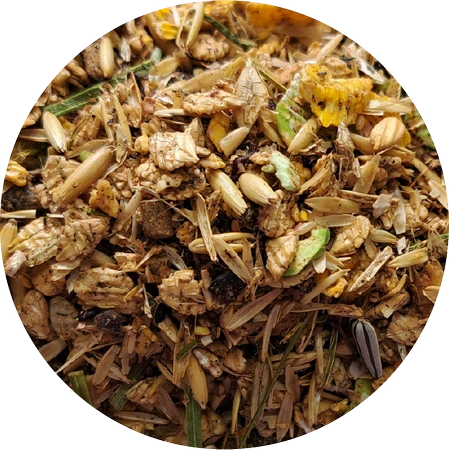 SKŁAD: płatki jęczmienne mikronizowane, miazga jabłkowa suszona, płatki kukurydziane mikronizowane, otręby ryżowe, lucerna suszona, otręby pszenne, olej rzepakowy, płatki nasion soi, melasa buraczana, fosforan jednowapniowy, marchew suszona, nasiona słonecznika, burak czerwony, pasternak, topinambur, chlorek sodu, kwiat nagietka, nasiona kozieradki, liść babki lancetowatej, węglan wapnia, tlenek magnezu, czerwone wapienne algi (lithothamne)