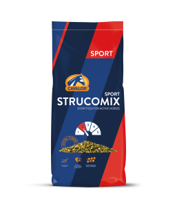 Cavalor Strucomix Sport to musli o podwyższonej zawartości włókna, opracowane dla aktywnych koni poddawanych regularnym i intensywnym treningom (poziom 2). Formuła zawiera długie włókna strukturalne, które wydłużają czas żucia, zwiększają produkcję śliny i wspierają motorykę jelit. Produkt wzbogacono w pre- i probiotyki sprzyjające prawidłowemu rozwojowi flory jelitowej – fundamentowi odporności i zdrowia układu pokarmowego. Dmuchane zboża ułatwiają trawienie i przyswajanie składników odżywczych, a kompleks multiwitamin wspiera efektywne uwalnianie energii i wydolność treningową.