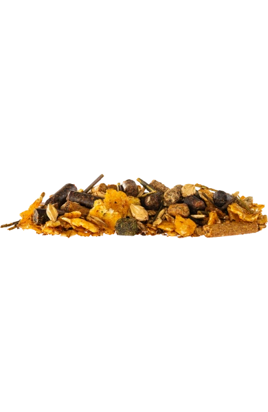 Płatki kukurydziane (36%), płatki jęczmienne (30%), mączka z traw i roślin zielonych (13%), miazga jabłkowa (10%), melasa (2,6%), suszona lucerna (2%), otręby pszenne (2%), węglan wapnia (1,3%), olej lniany (1,1%), chlorek sodu (0,5%), olej roślinny (0,5%), fosforan jednowapniowy (0,3%), tlenek magnezu (0,3%).