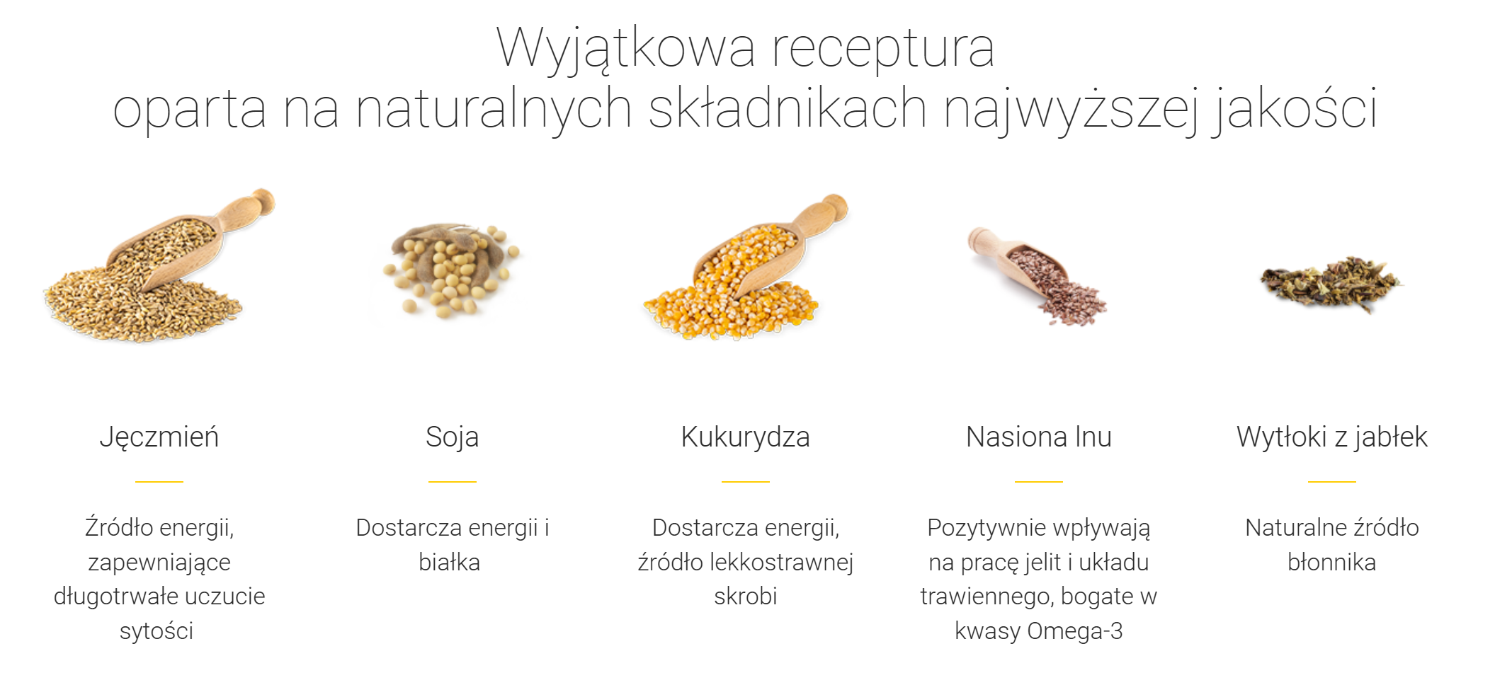 Skład: płatki jęczmienne poddane obróbce hydrotermicznej (26,4%), płatki kukurydziane poddane obróbce hydrotermicznej (20%), płatki sojowe poddane obróbce hydrotermicznej (20%), śruta poekstrakcyjna lniana (15%), miazga jabłkowa (3,6%), melasa (3,3%), otręby pszenne (3%), drożdże (2,1%), węglan wapnia (2%), chlorek sodu (1,5%), olej roślinny rafinowany (1,4%), fosforan jednowapniowy (0,5%).