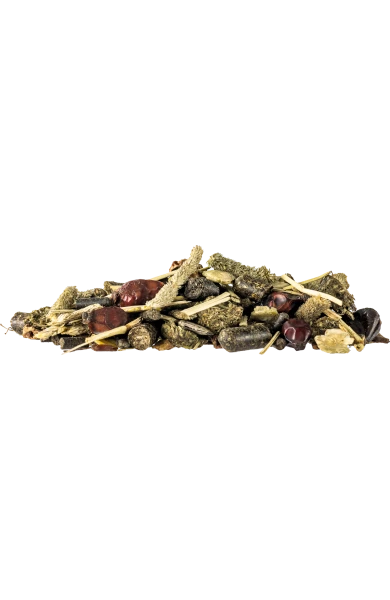 Skład: granulowana mączka z traw i roślin zielonych (27,2%), makuch z siemienia lnianego (15,2%), suszone trawy łąkowe (13,5%), suszone włókna jabłkowe (10,5%), granulowane łuski nasion słonecznika (6%), suszone strąki szarańczynu strąkowego (5%), suszona i rozdrobniona tymotka łąkowa (4,5%), jabłko i winogrono (4,1%), płatki grochowe (3,5%), olej roślinny rafinowany (3,1%), nasiona słonecznika (3%), białko ziemniaczane (1,8%), owoc dzikiej róży (1%), białko grochu (0,7%), oregano i kwiaty nagietka (0,3%).