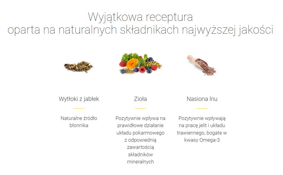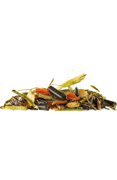 granulowana mączka z traw i roślin zielonych (37,3%), śruta poekstrakcyjna z nasion słonecznika (13%), makuch z siemienia lnianego (11,9%), lucerna suszona i rozdrobniona (6%), miazga jabłkowa (5,5%), suszone strąki szarańczynu strąkowego (5%), olej z ostropestu plamistego (4,9%), miazga jabłkowa (3,8%), nasiona słonecznika (2,9%), marchew suszona (2%), melasa (1,2%), zioła (ostropest, pokrzywa, mniszek, głóg) (1%), płatki grochowe (1%), drożdże piwne (1%), fosforan wapniowo-sodowy (0,9%), węglan wapnia (0,7%), chlorek sodu (0,6%), tlenek magnezu (0,5%).