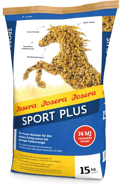 Josera Sport Plus to wysokoenergetyczne musli dla koni sportowych, zapewniające moc, siłę i wytrzymałość nawet przy mniejszych dawkach. Dzięki poddanym obróbce hydrotermicznej płatkom zbóż pasza jest wyjątkowo dobrze przyswajalna, a wysokiej jakości oleje roślinne stanowią wolno uwalniane źródło energii, idealne dla koni w treningu i na zawodach.