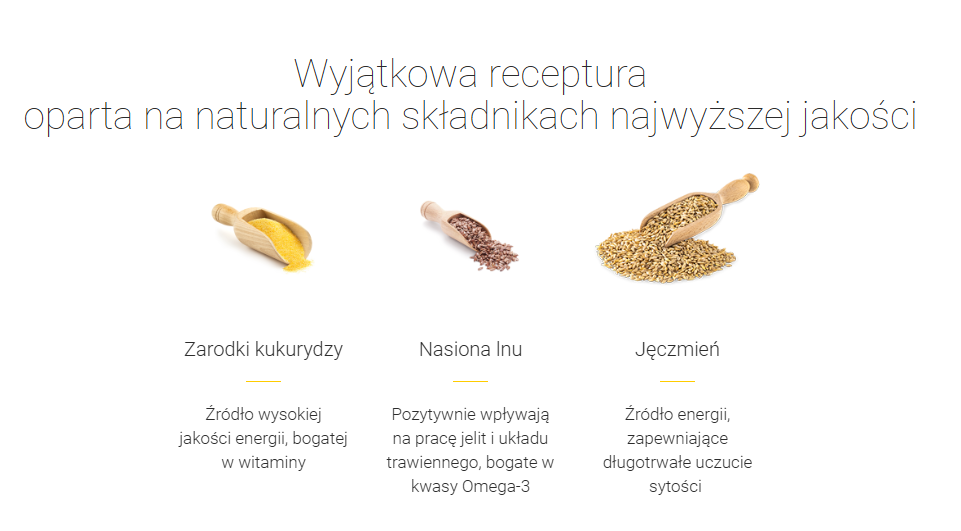formuła bez owsa, wysoka koncentracja energii, wysokiej jakości oleje roślinne, witamina E, selen i kwasy omega-3 dla ochrony mięśni, probiotyczne drożdże dla zdrowej flory jelitowej, optymalna strawność.